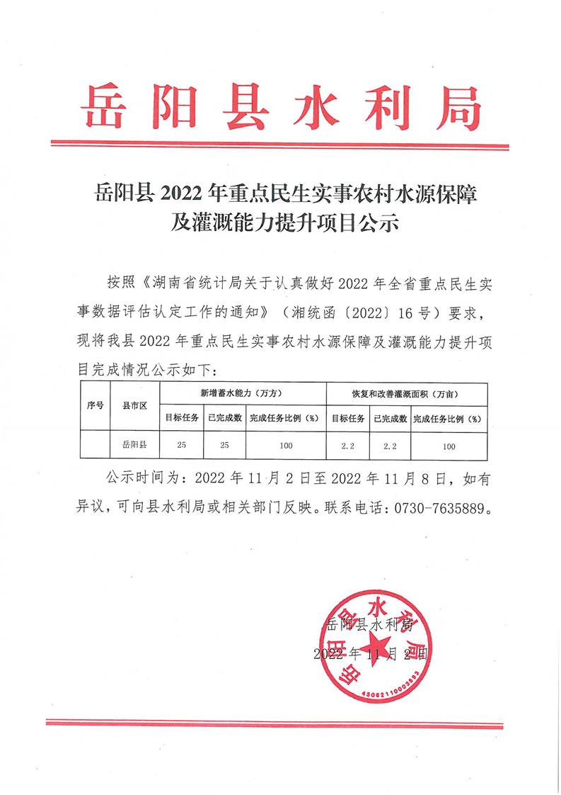 嶽陽縣2022年重點民生實事農村水源保障及灌溉能力提升項目公示