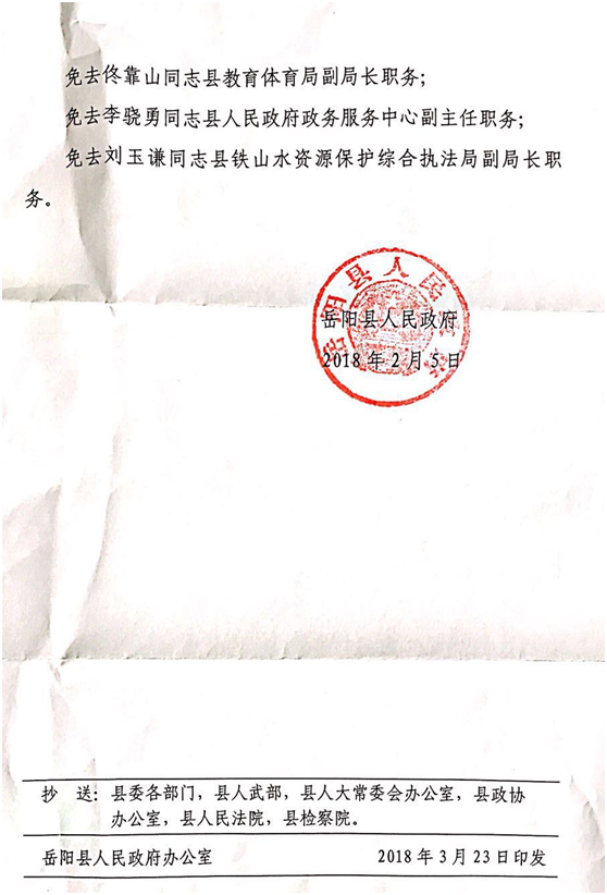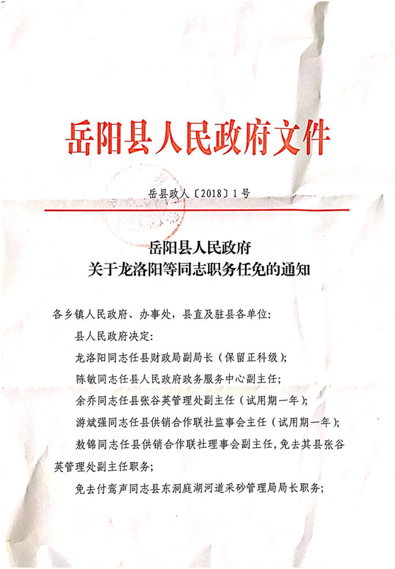 嶽陽縣人民政府關於龍洛陽等同誌職務任免的通知