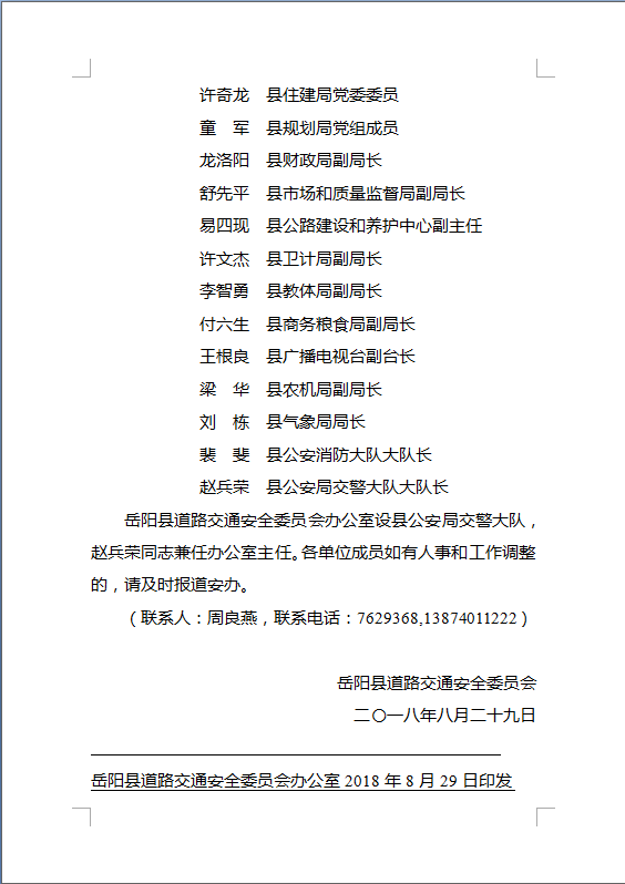 關於調整嶽陽縣道路交通安全委員會 成員的通知