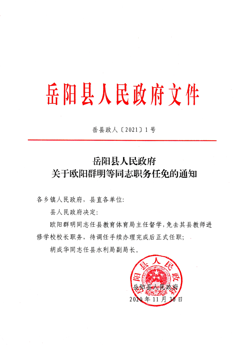 關於歐陽群明等通知職務任免的通知