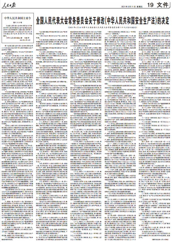《全國人民代表大會常務委員會關於修改〈中華人民共和國安全生產法〉的決定》已由中華人民共和國第十三屆全國人民代表大會常務委員會第二十九次會議於2021年6月10日通過,現予公布,自2021年9月1日起施行。