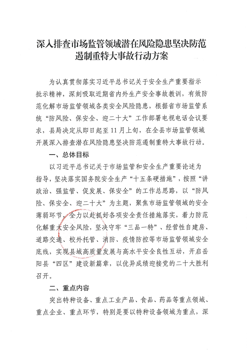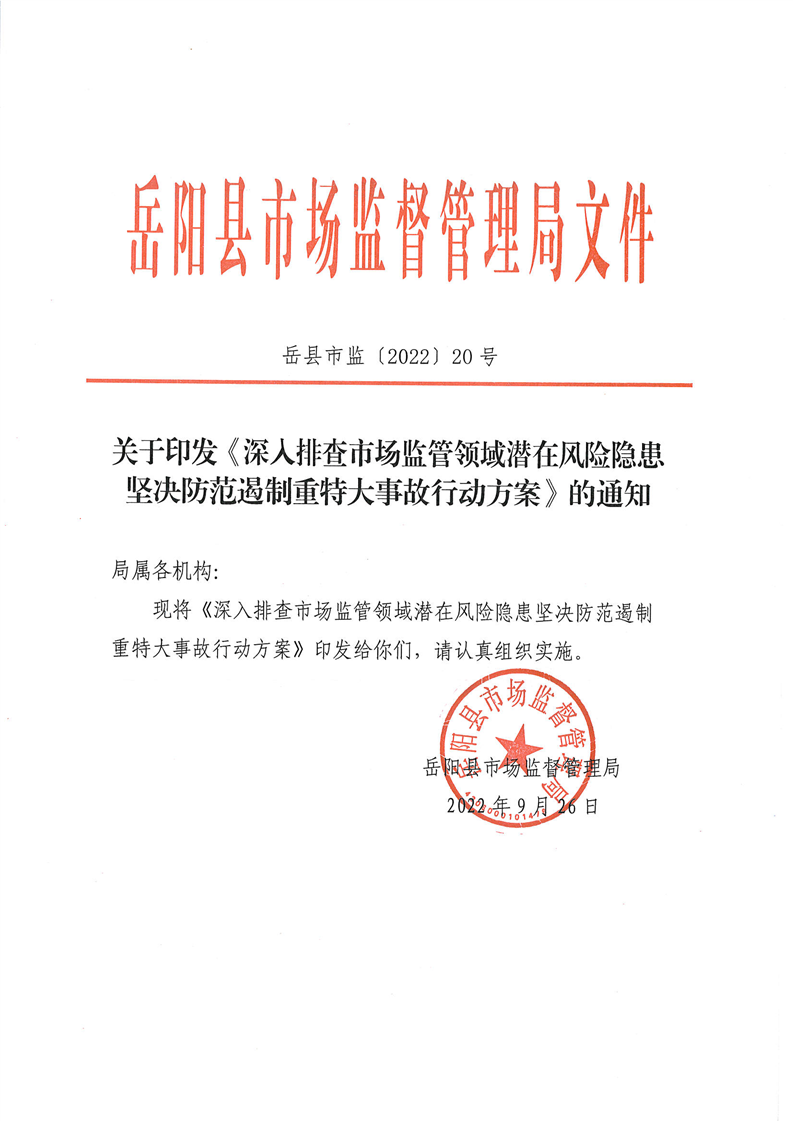 嶽陽縣市場監督管理局:深入排查市場監管領域潛在風險隱患堅決防範遏製重特大事故行動方案
