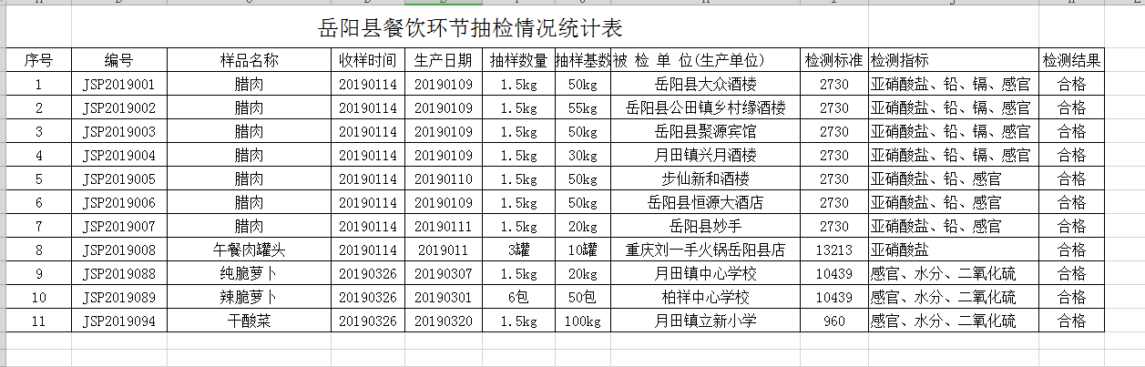 嶽陽縣餐飲環節抽檢情況統計表1