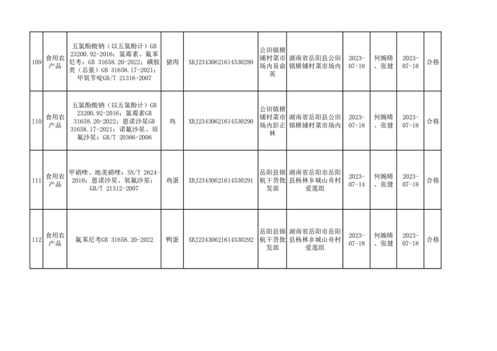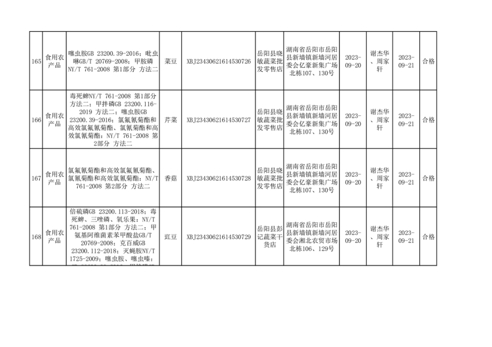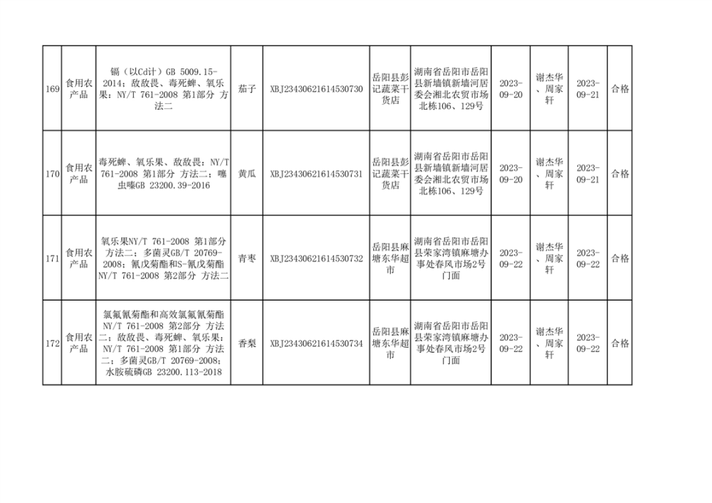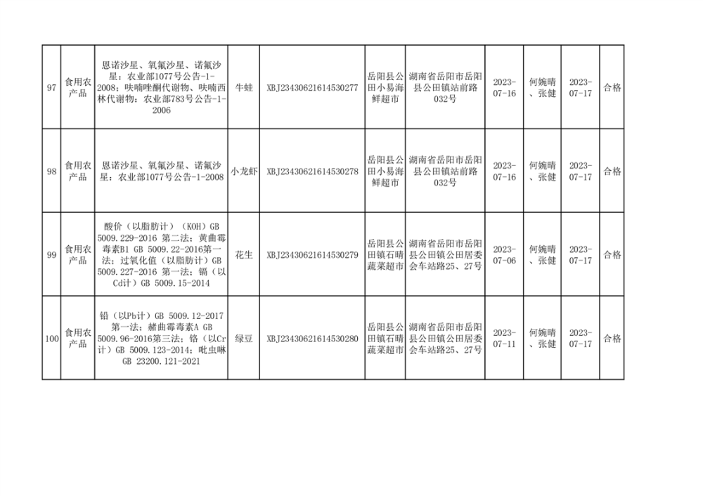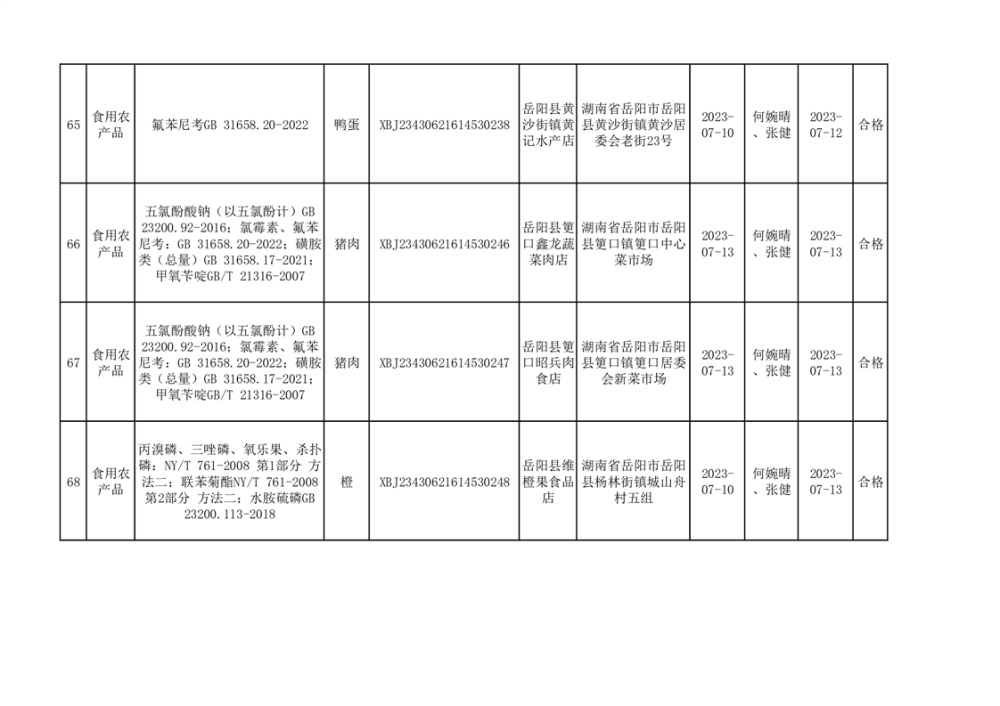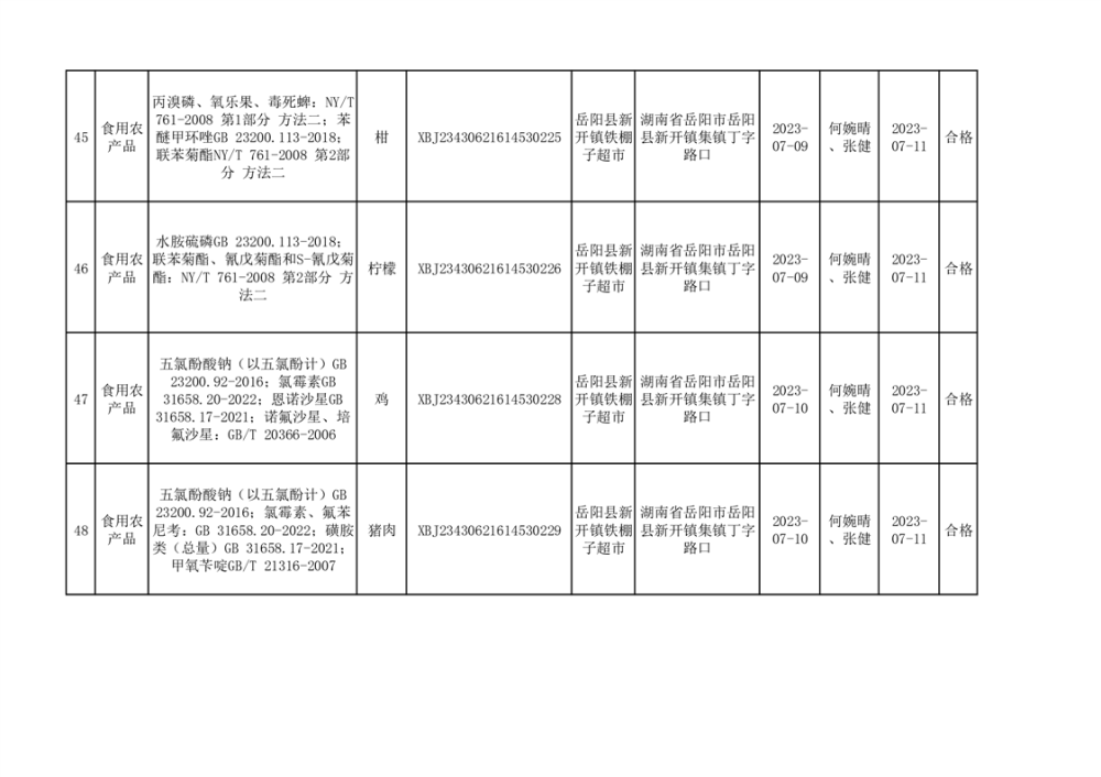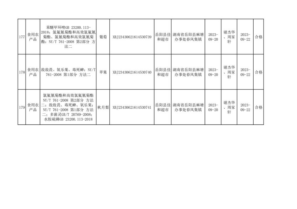 食用農產品合格產品抽檢信息公示(179批次)