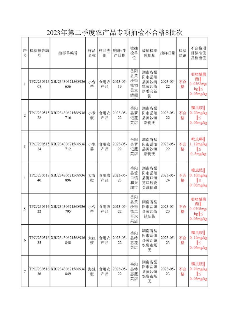 2023年第二季度農產品抽檢不合格品(8批次)