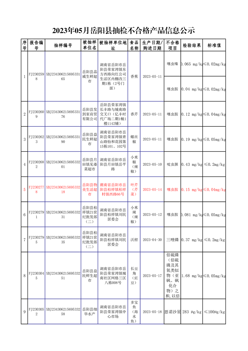 2023年5月抽檢不合格品公示(11批次)