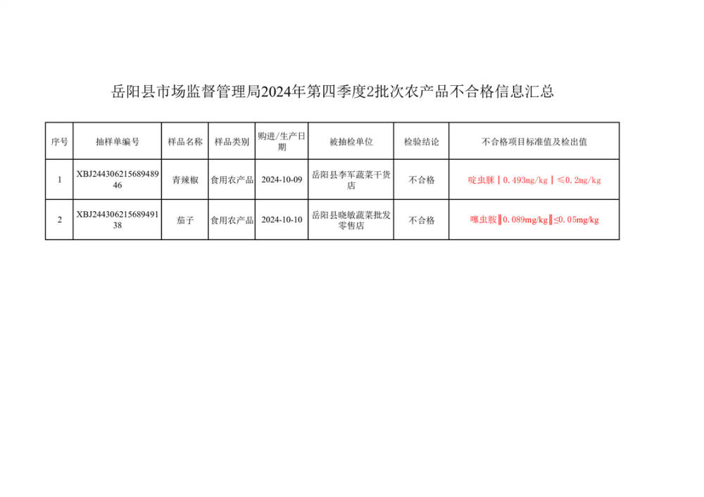 2024年第四季度抽檢結果匯總(不合格2批次)