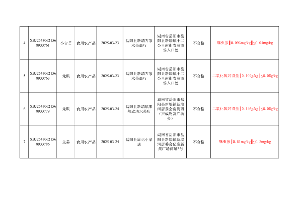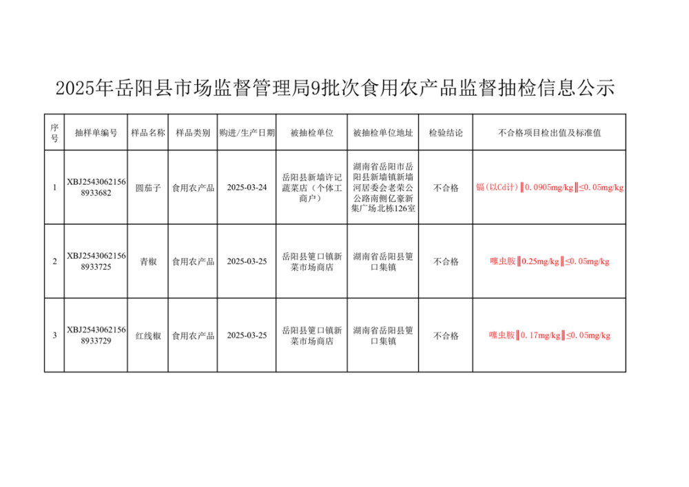 2025年嶽陽縣市場監督管理局9批次食用農產品監督抽檢不合格信息公示(2025年5月12日)
