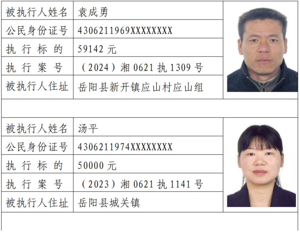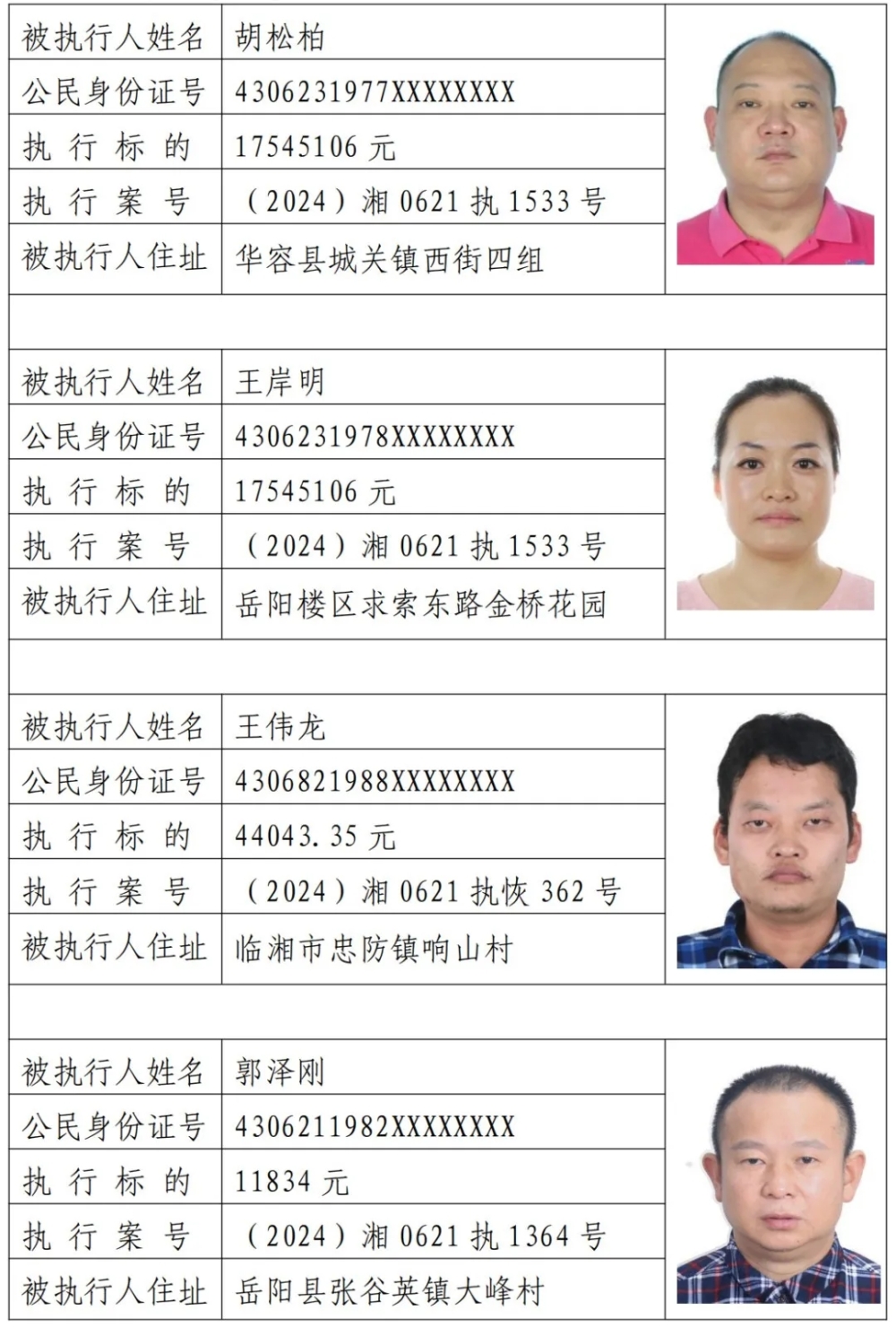 為敦促被執行人自覺履行生效法律文書確定的義務,努力推進社會誠信建設。根據《中華人民共和國民事訴訟法》《最高人民法院關於公布失信被執行人名單信息的若幹規定》等相關法律和規定,本院決定對下列失信被執行人信息予以曝光。曝光人員應立即履行生效法律文書確定的義務,否則將視情節采取罰款、拘留等強製措施,對拒不履行、抗拒執行、規避執行的被執行人將依法追究刑事責任。【備注:下述失信被執行人名單信息僅代表本次曝光時段情況,實時失信被執行人信息以最高院網站查詢結果為準。歡迎廣大人民群眾對已曝光被執行人行蹤及財產線索進行舉報。舉報電話:0730-7668833。】