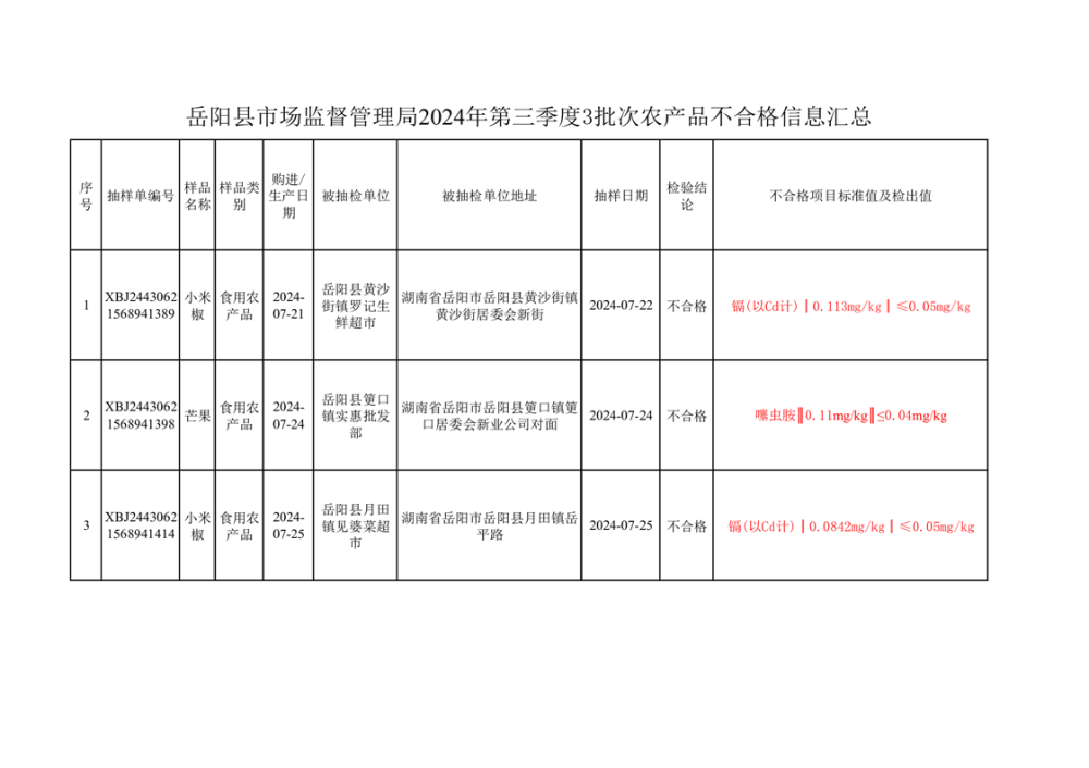 2024年8月份食品抽檢數據公示(不合格3批次)