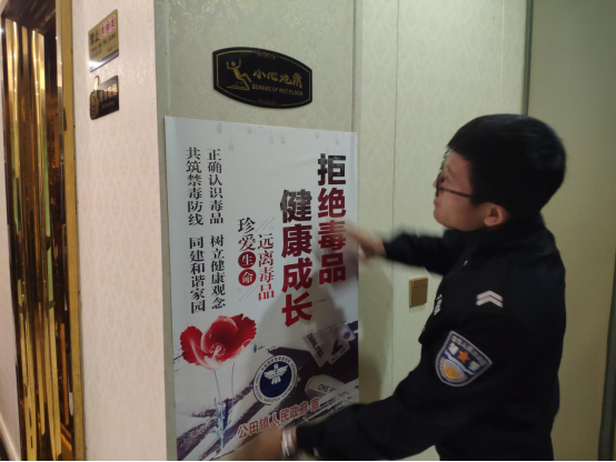 為進一步加強公共娛樂場所禁毒宣傳力度,積極營造良好的公共娛樂場所環境,提高娛樂場所服務人員禁毒意識。2020年11月25日,公田鎮禁毒辦聯合公田派出所對轄區內的賓館、KTV等娛樂場所進行禁毒巡查及培訓活動。本次行動主要是對娛樂場所的禁毒宣傳進行實地檢查、張貼禁毒海報、跟從業人員普及禁毒知識、填寫禁毒巡查台賬、隨機抽查人員進行尿檢等。
