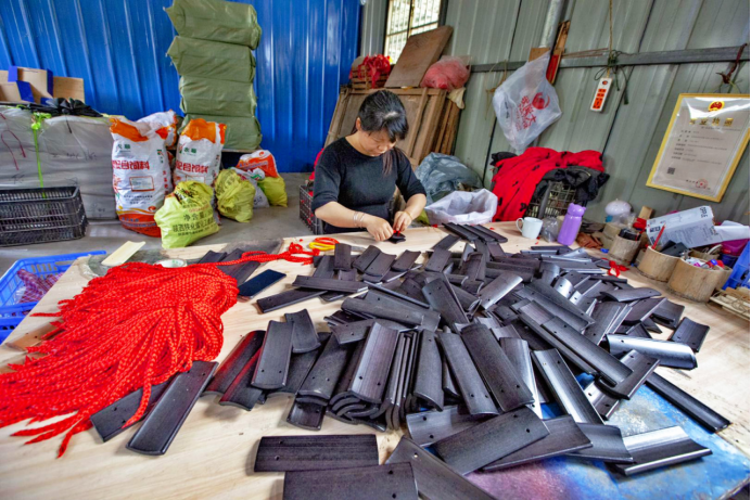 嶽陽縣張穀英鎮大明山村發展扶貧產業,將毛竹、苦竹製成竹笛、葫蘆絲、快板,暢銷國內外。