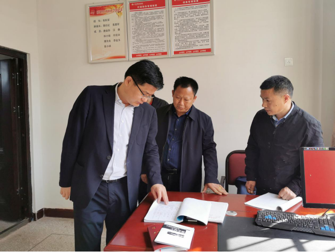 縣委書記田文靜(左一)柏祥鎮萬慶村村部查閱扶貧資料