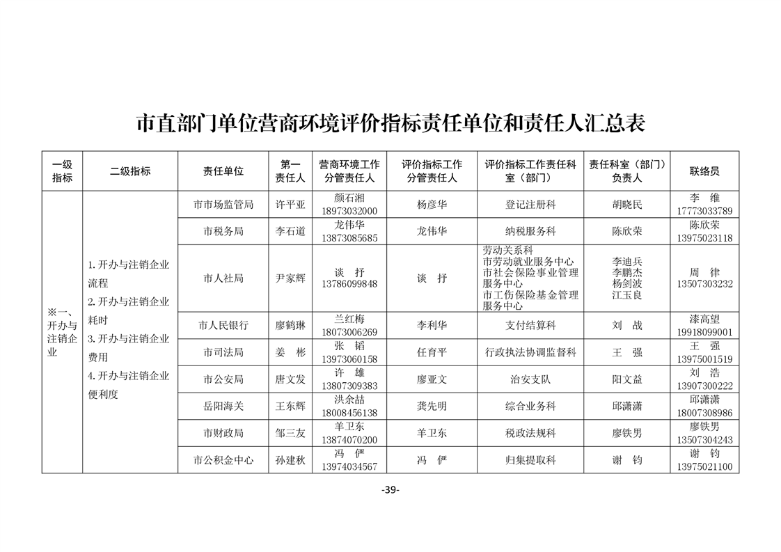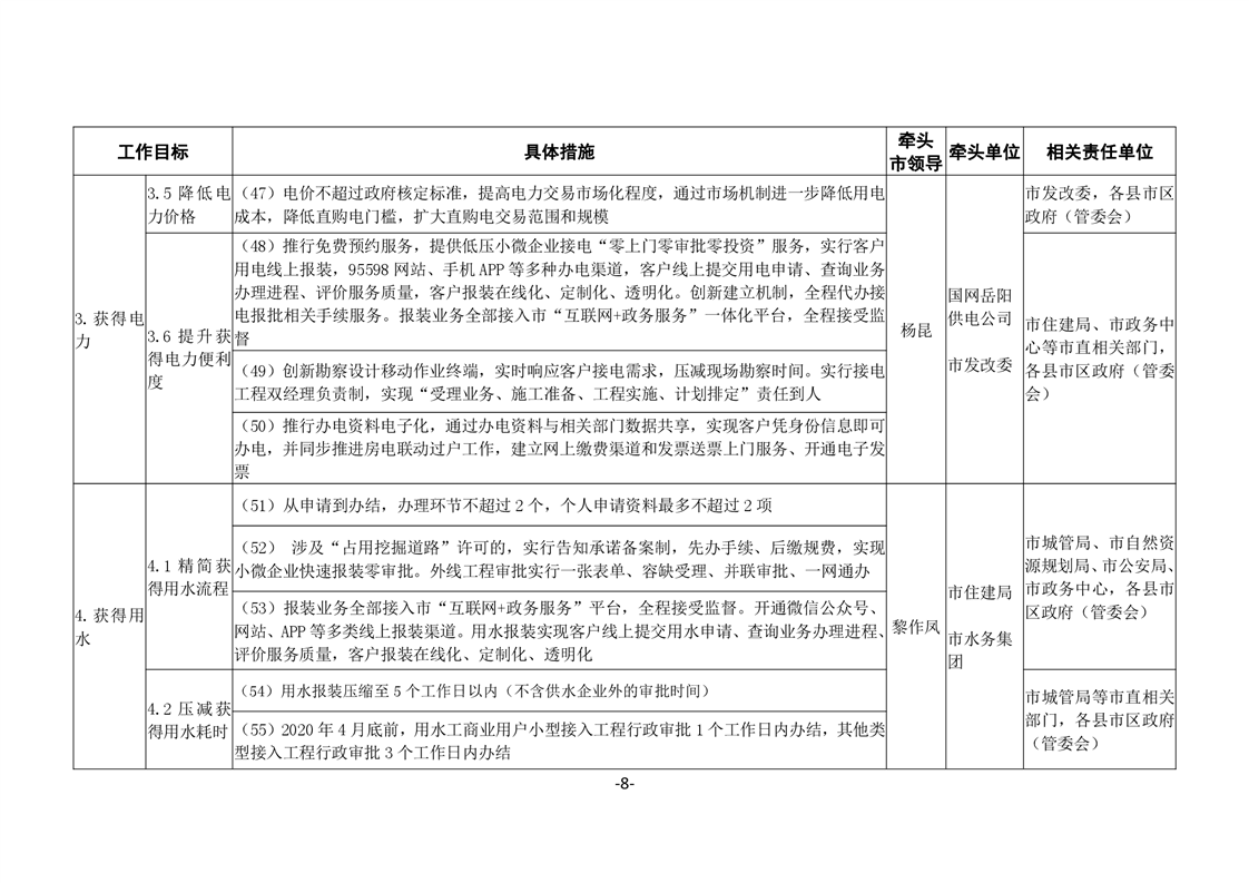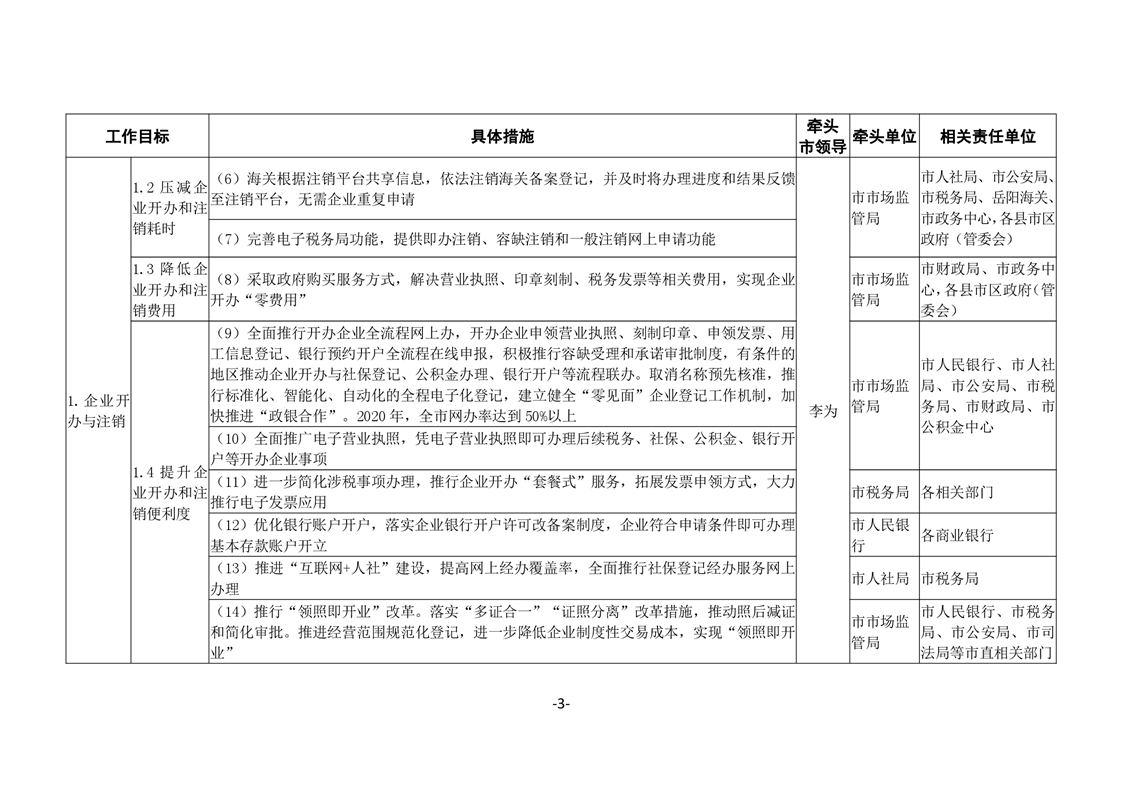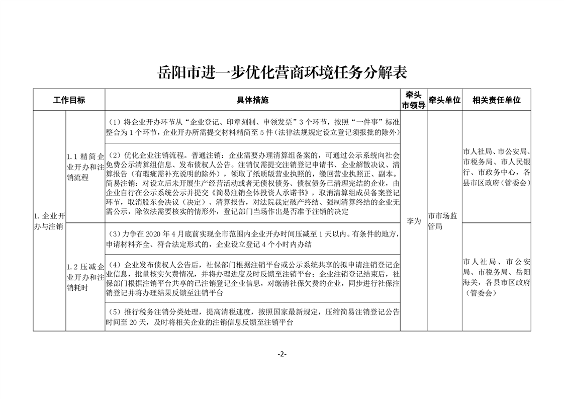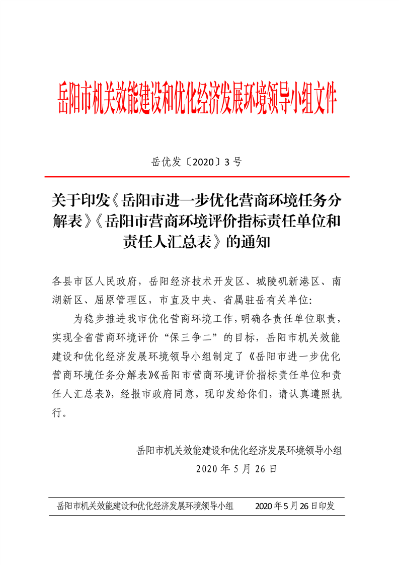 關於印發《嶽陽市進一步優化營商環境任務分解表》《嶽陽市營商環境評價指標責任單位和責任人匯總表》的通知(嶽優發〔2020〕3號)