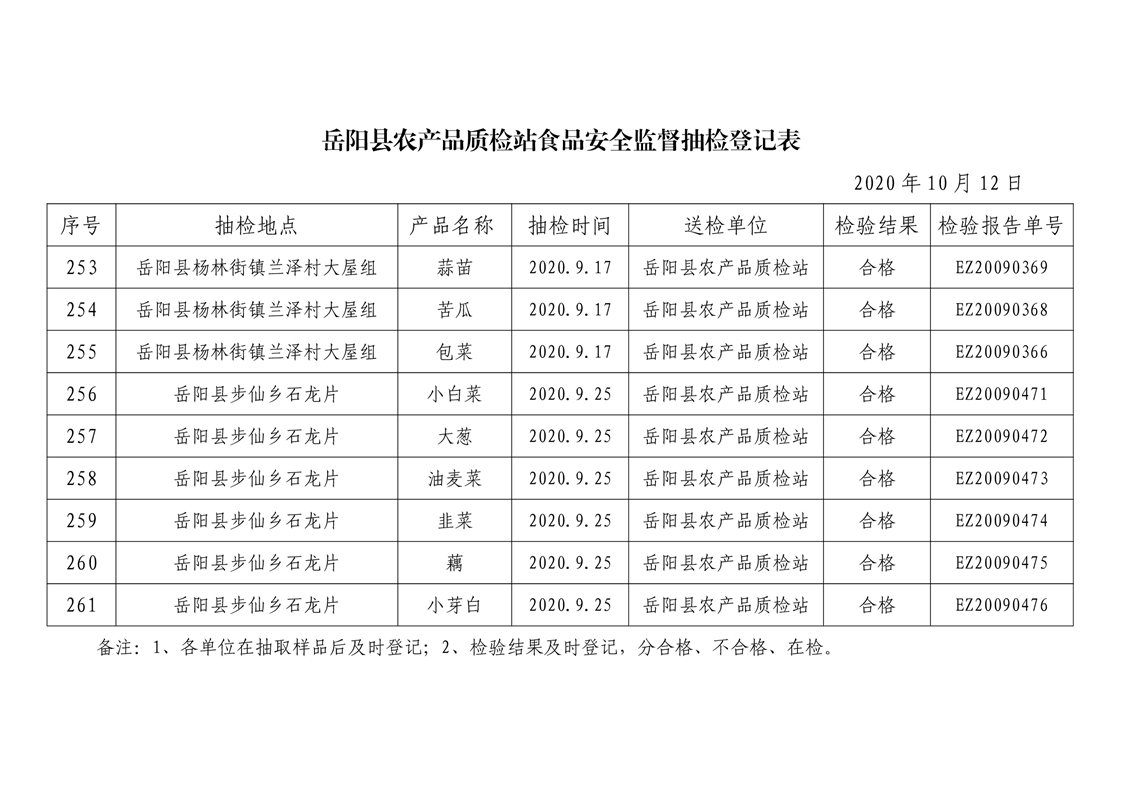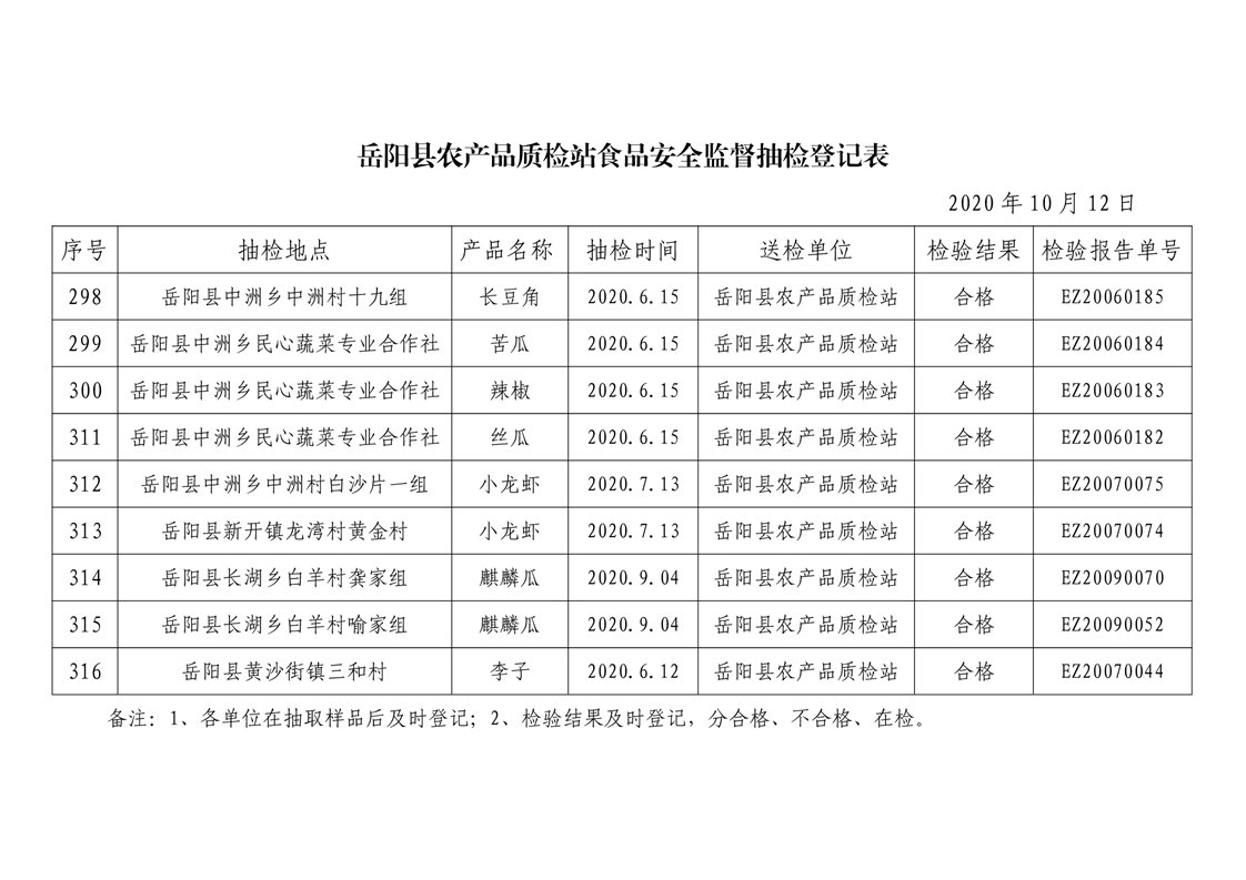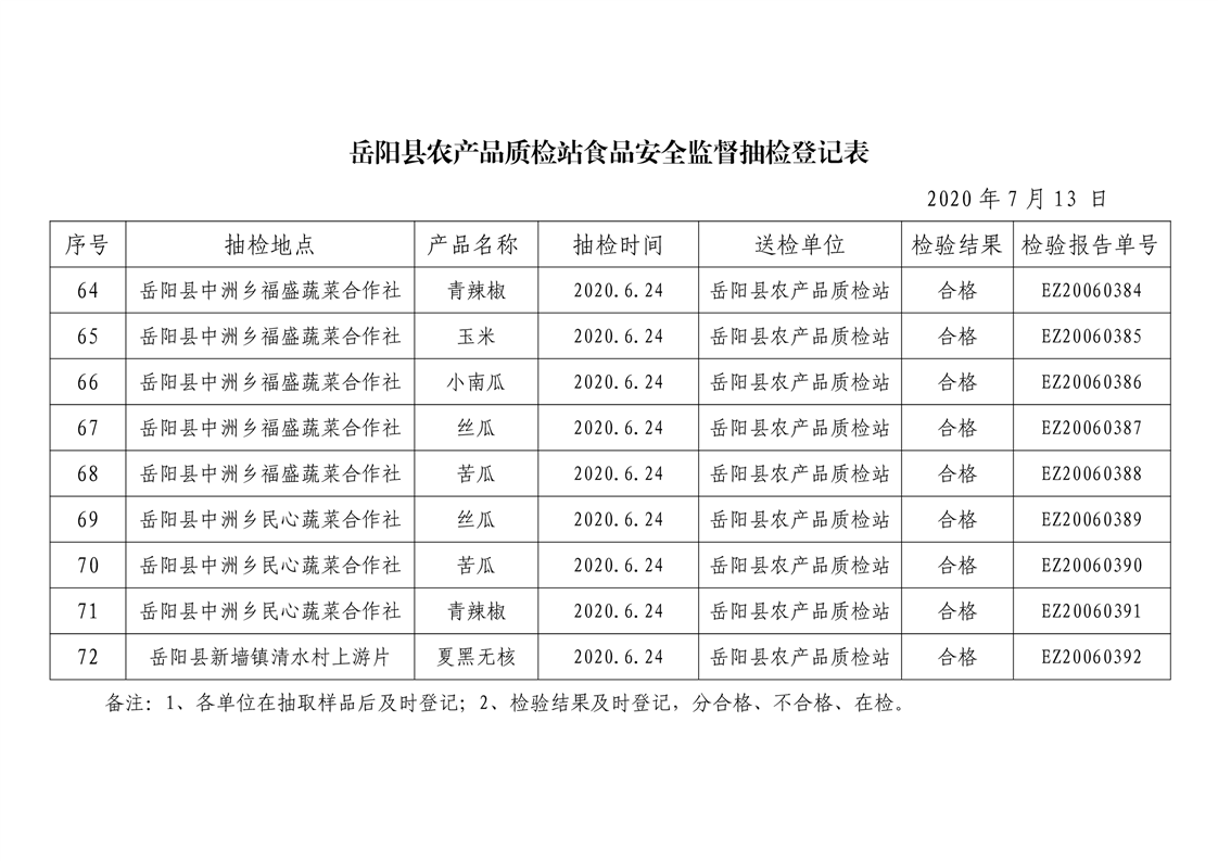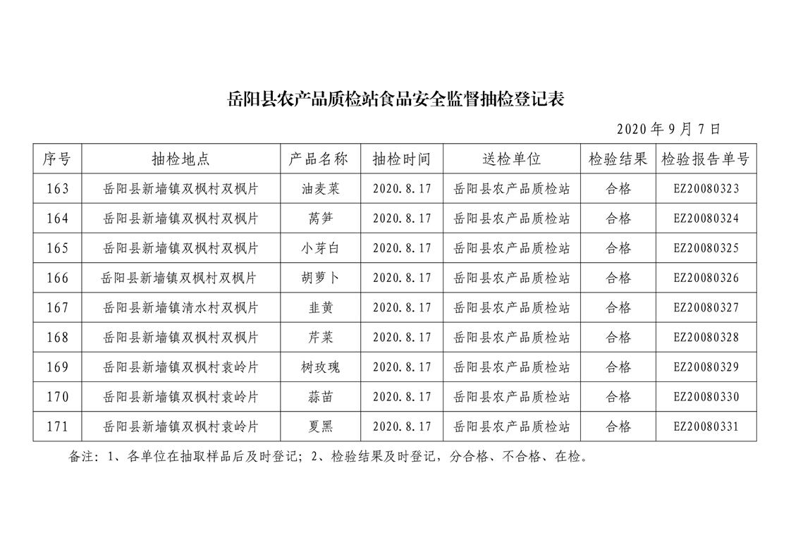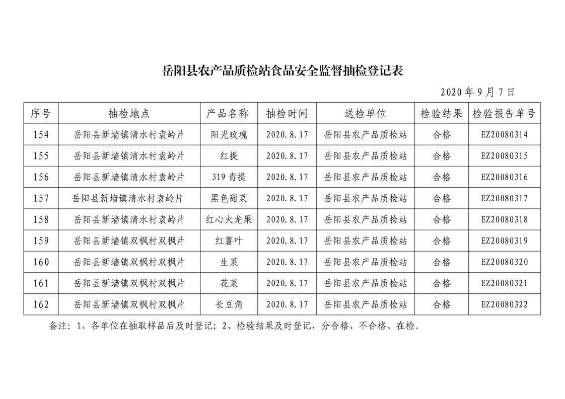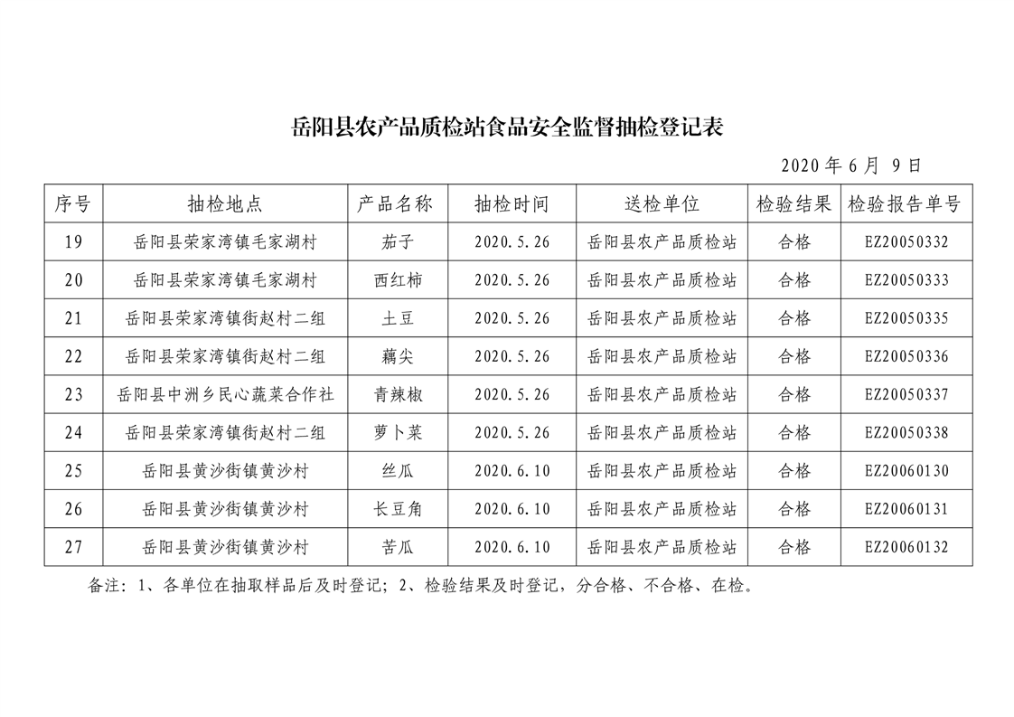 嶽陽縣農產品質檢站2020年食品安全監督抽檢情況公示