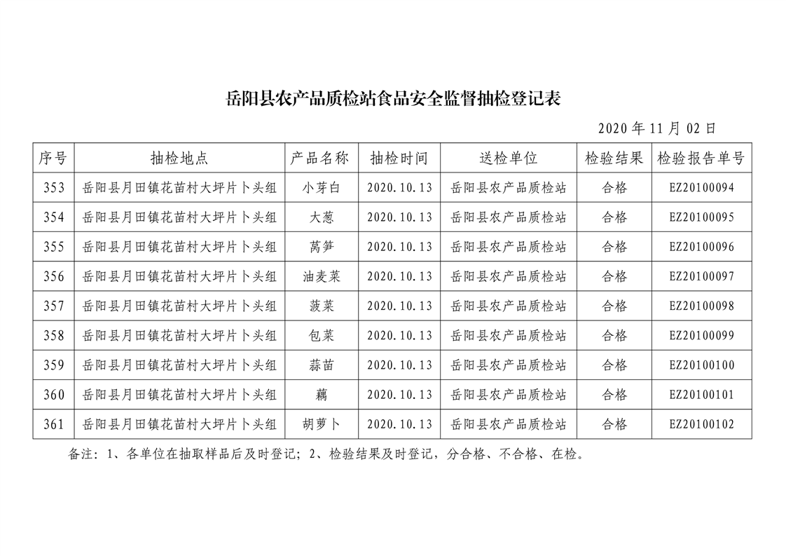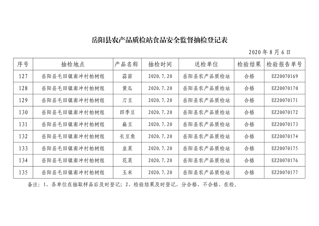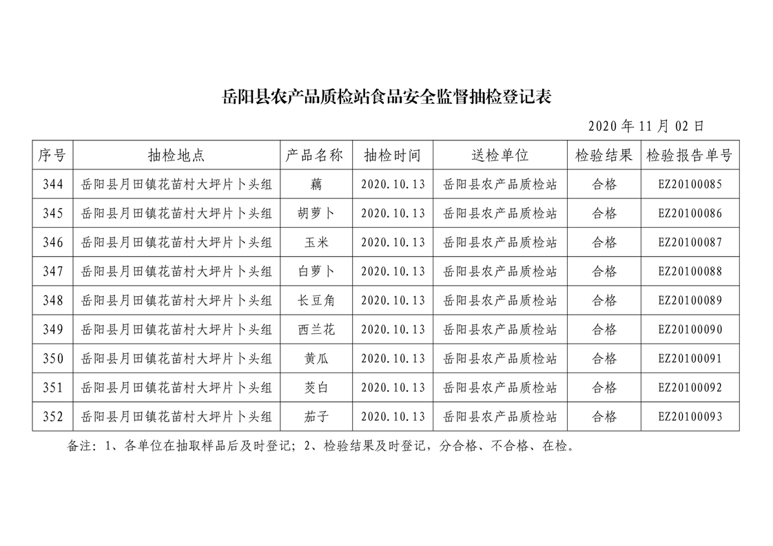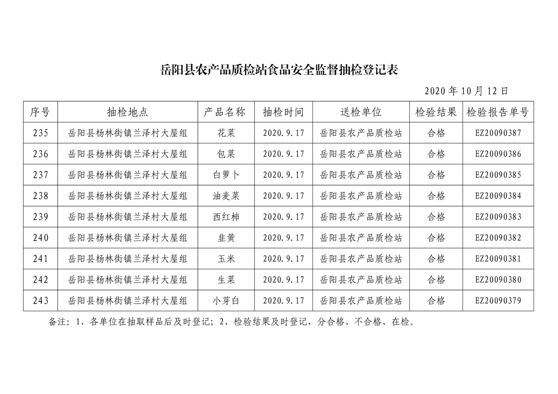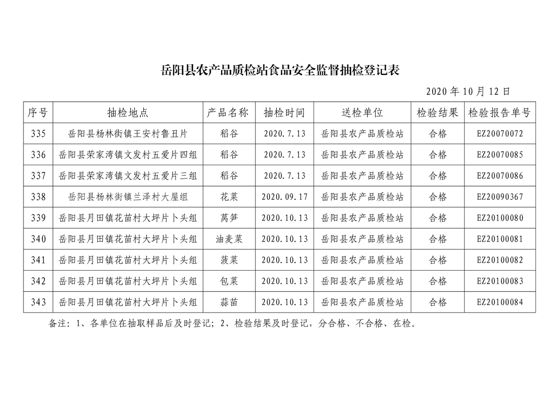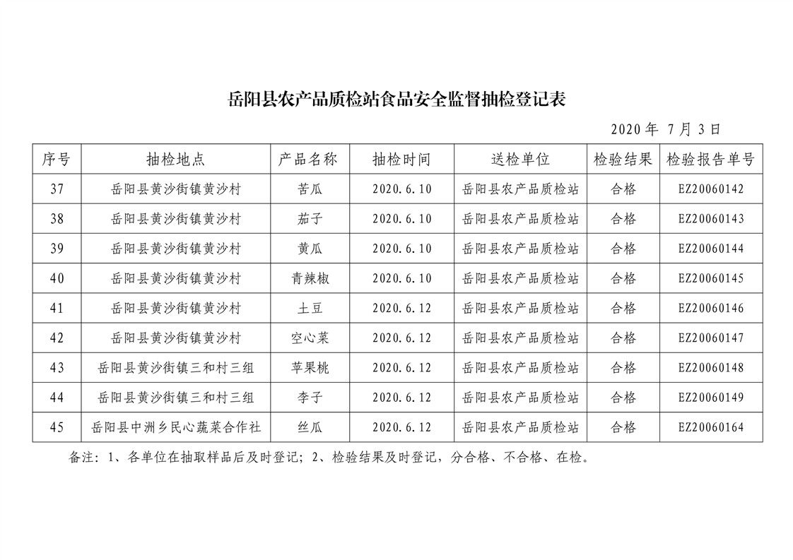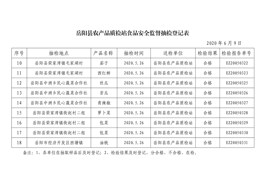 嶽陽縣農產品質檢站2020年食品安全監督抽檢情況公示