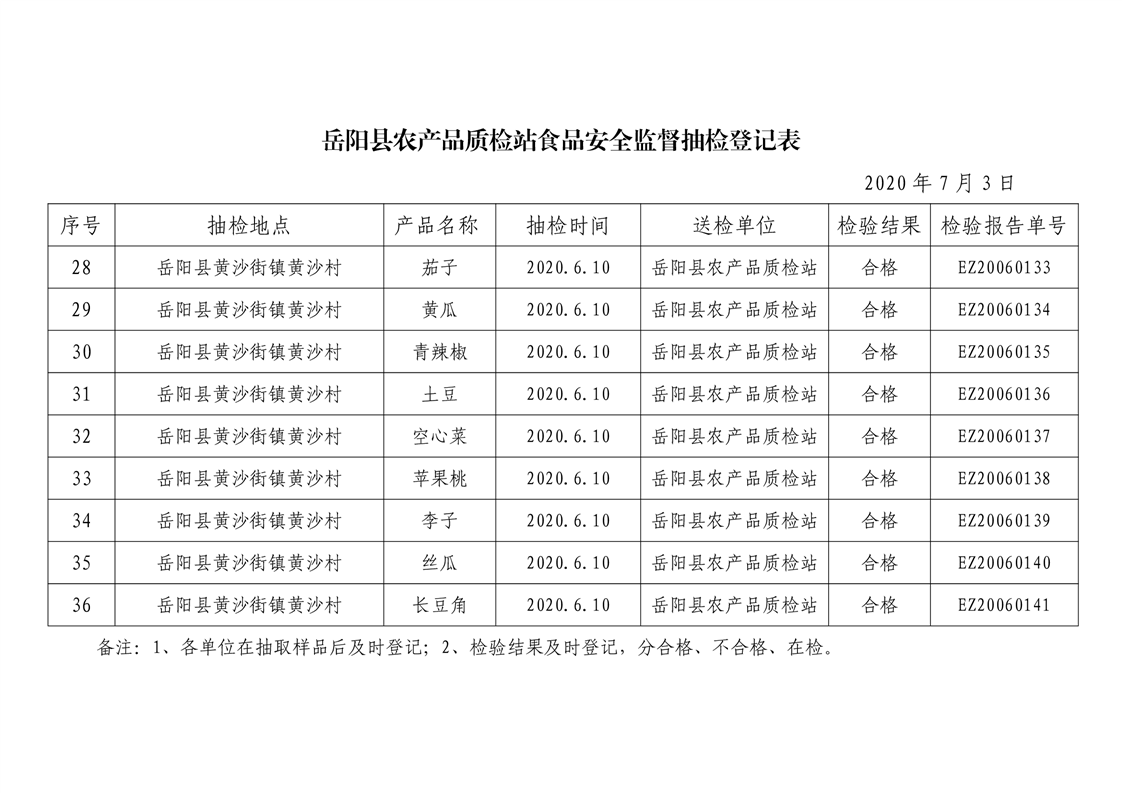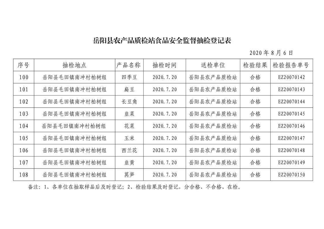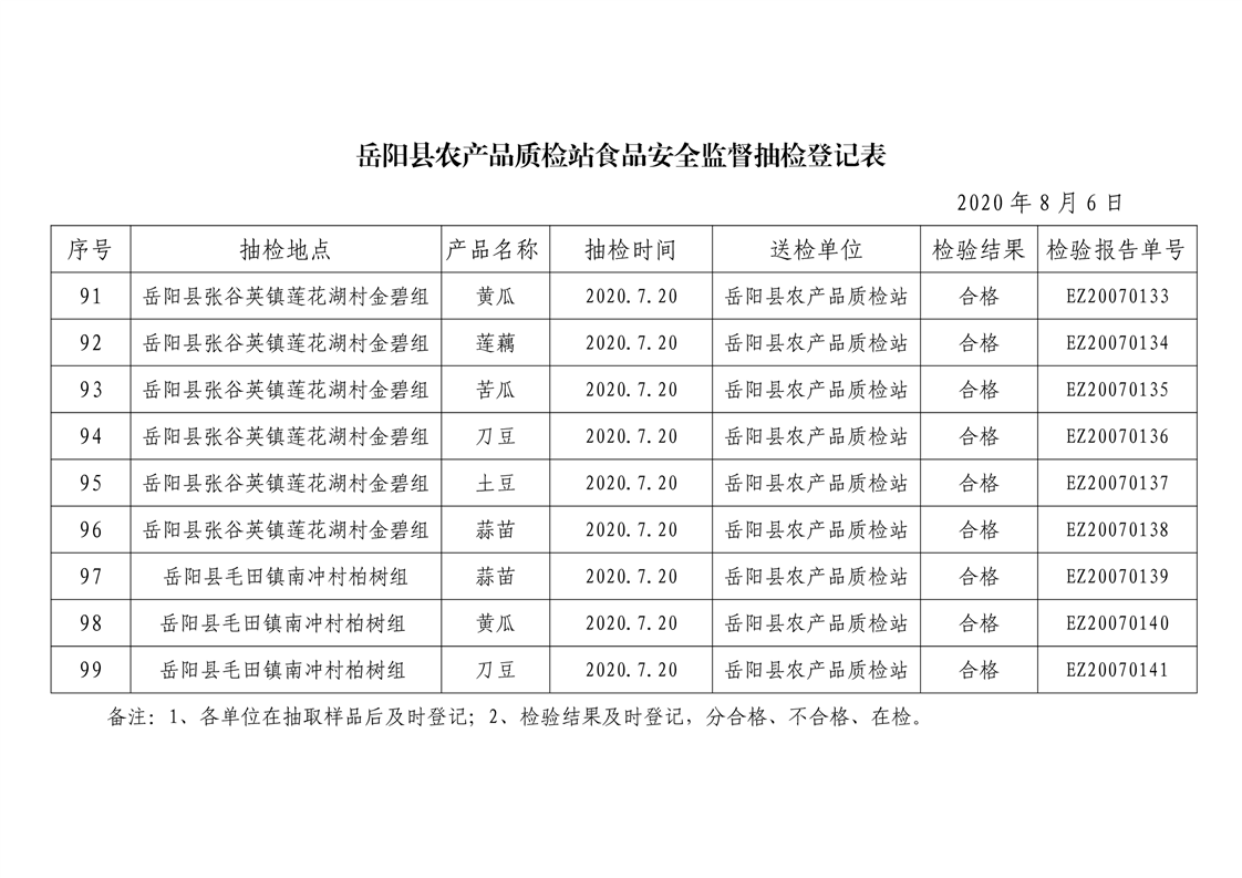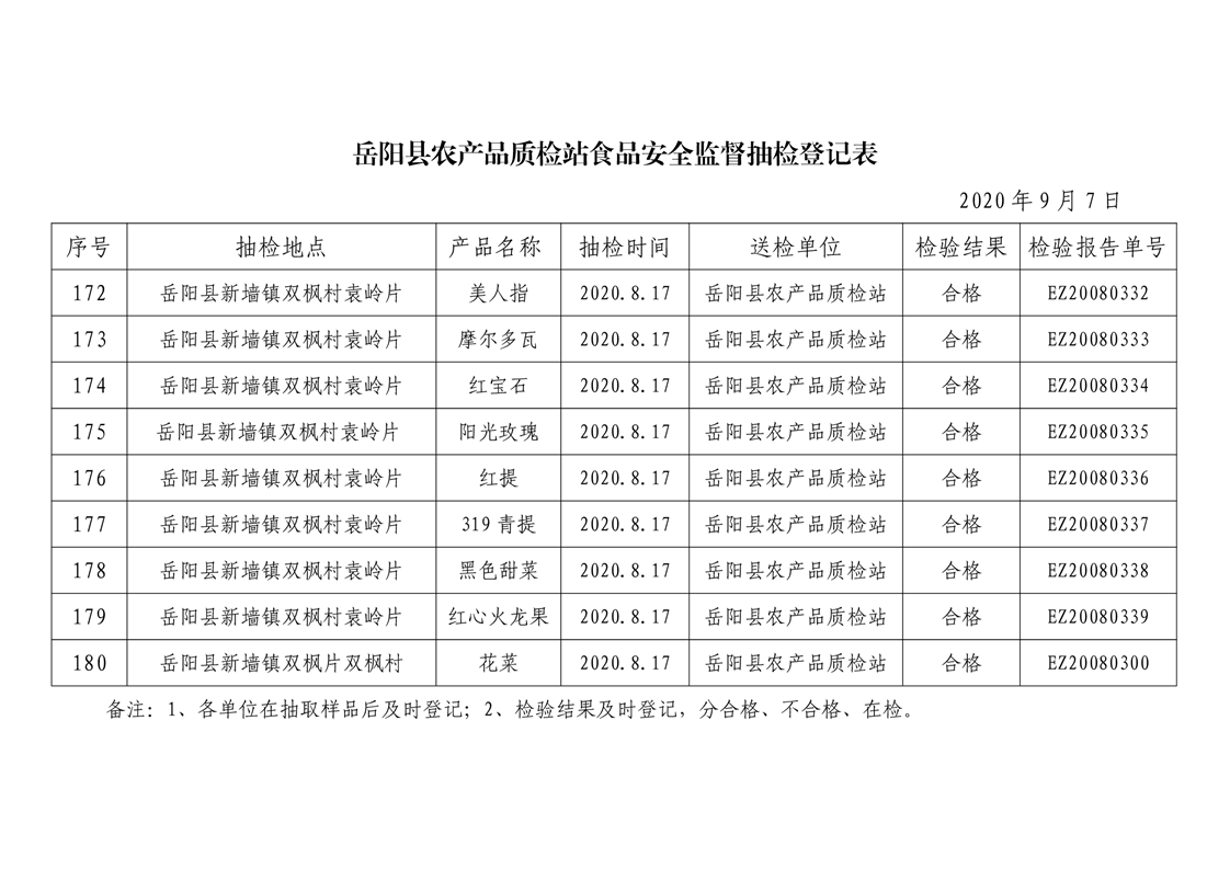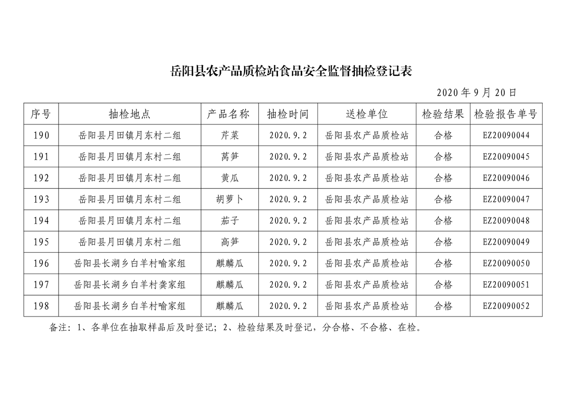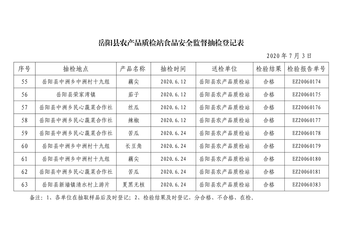 嶽陽縣農產品質檢站2020年食品安全監督抽檢情況公示
