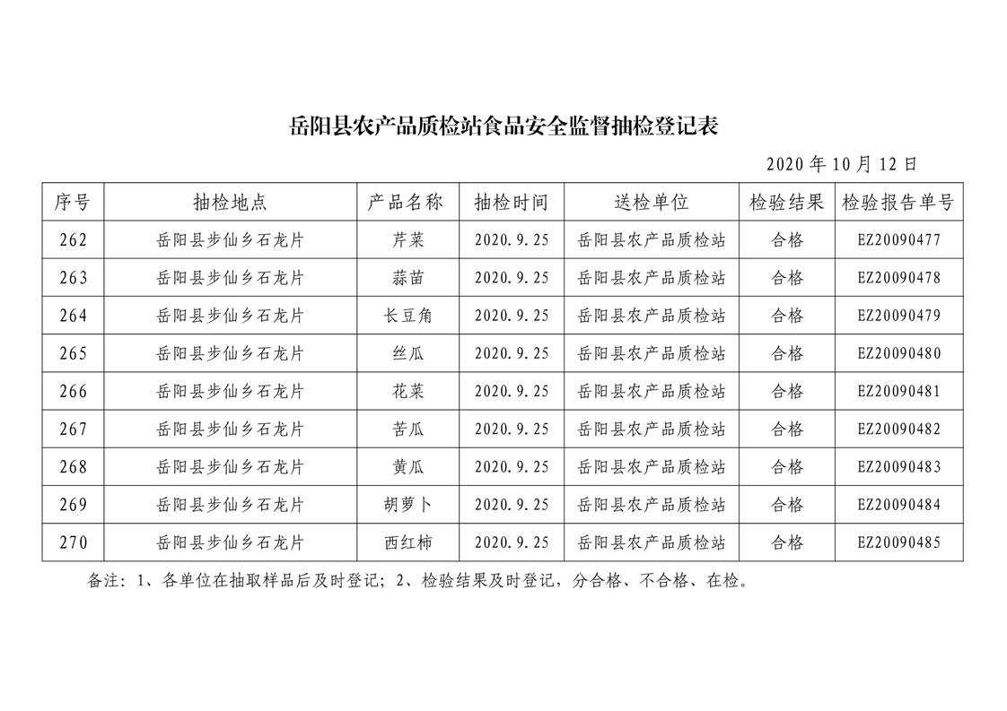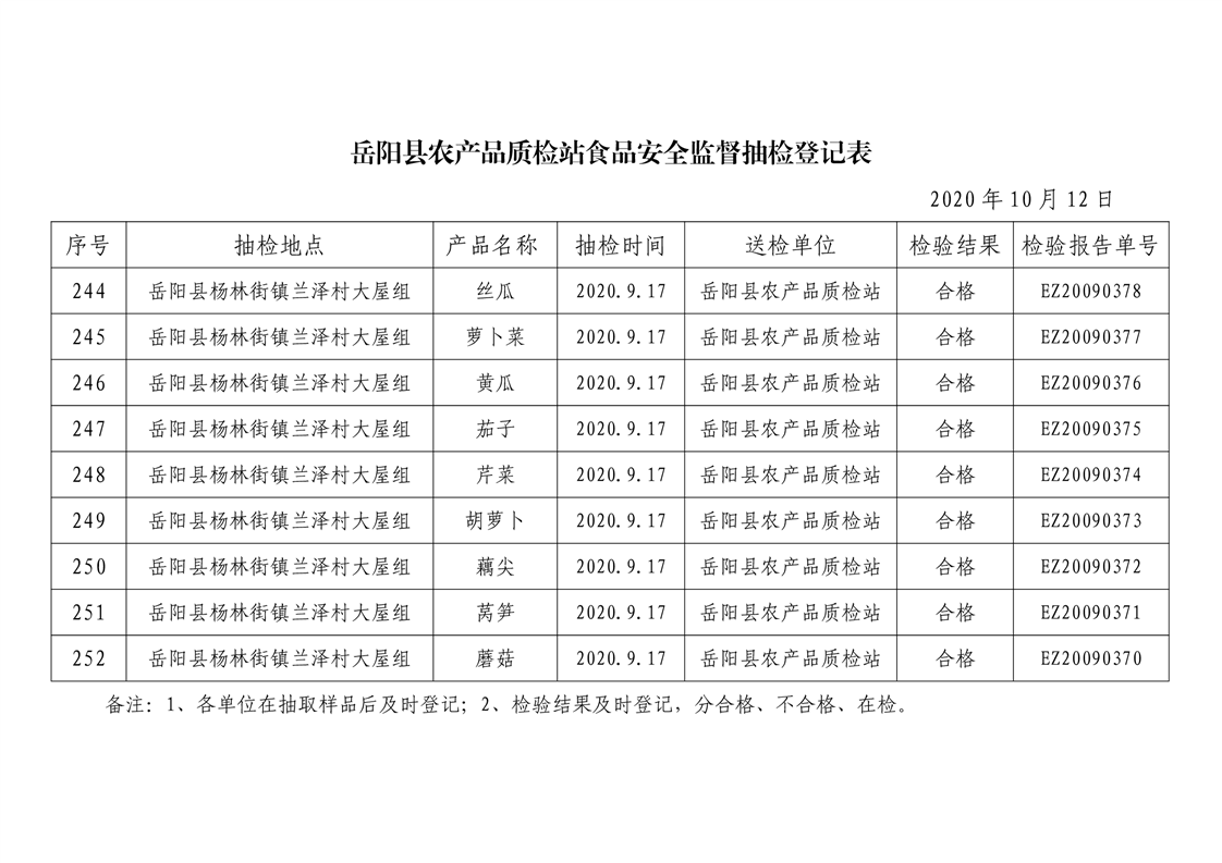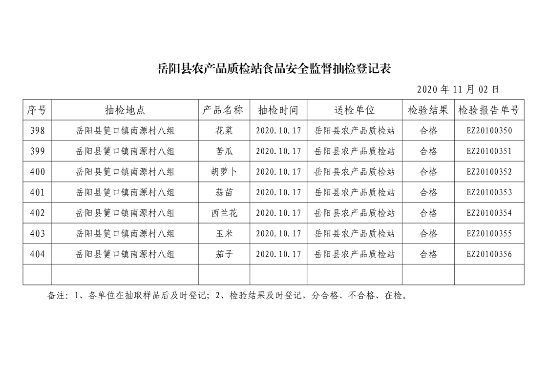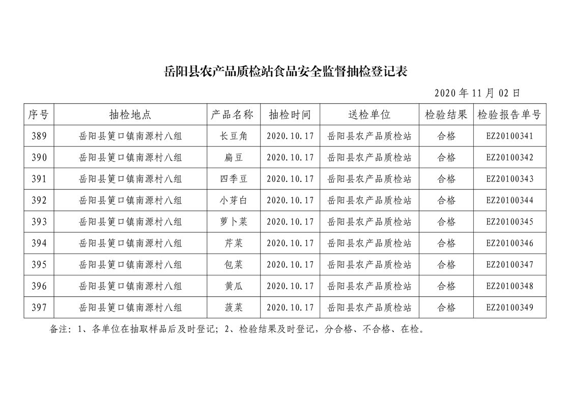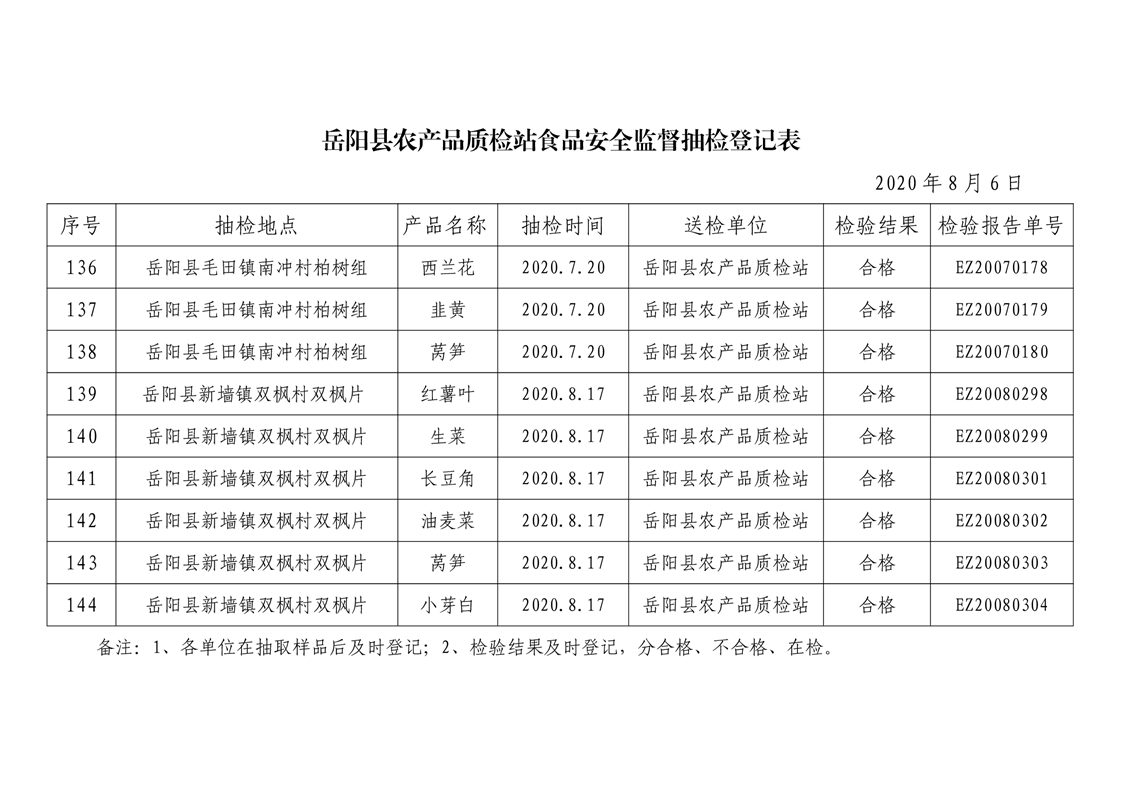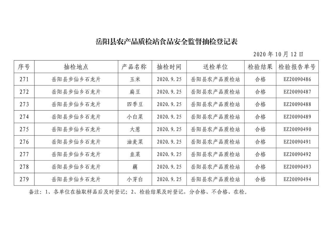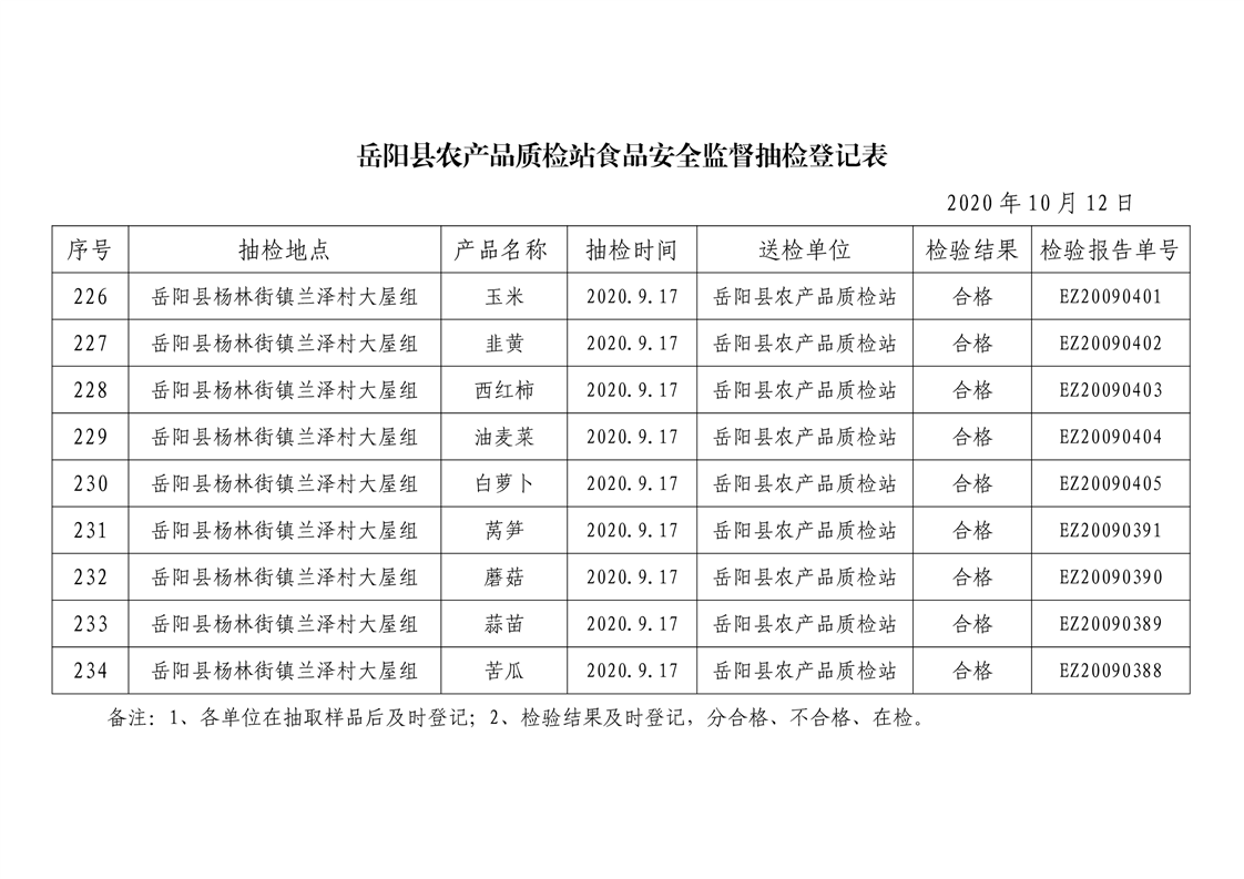 嶽陽縣農產品質檢站2020年食品安全監督抽檢情況公示