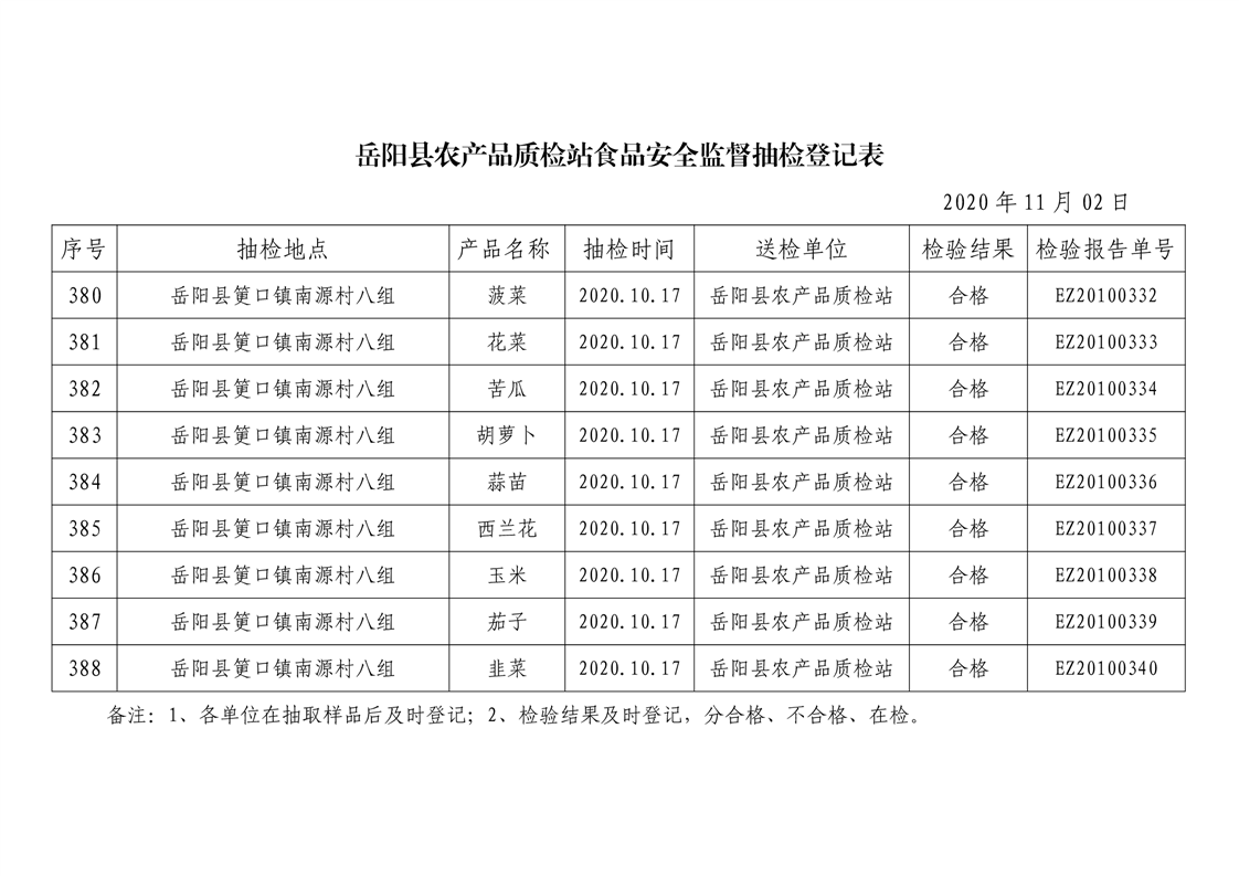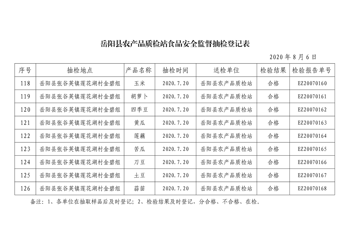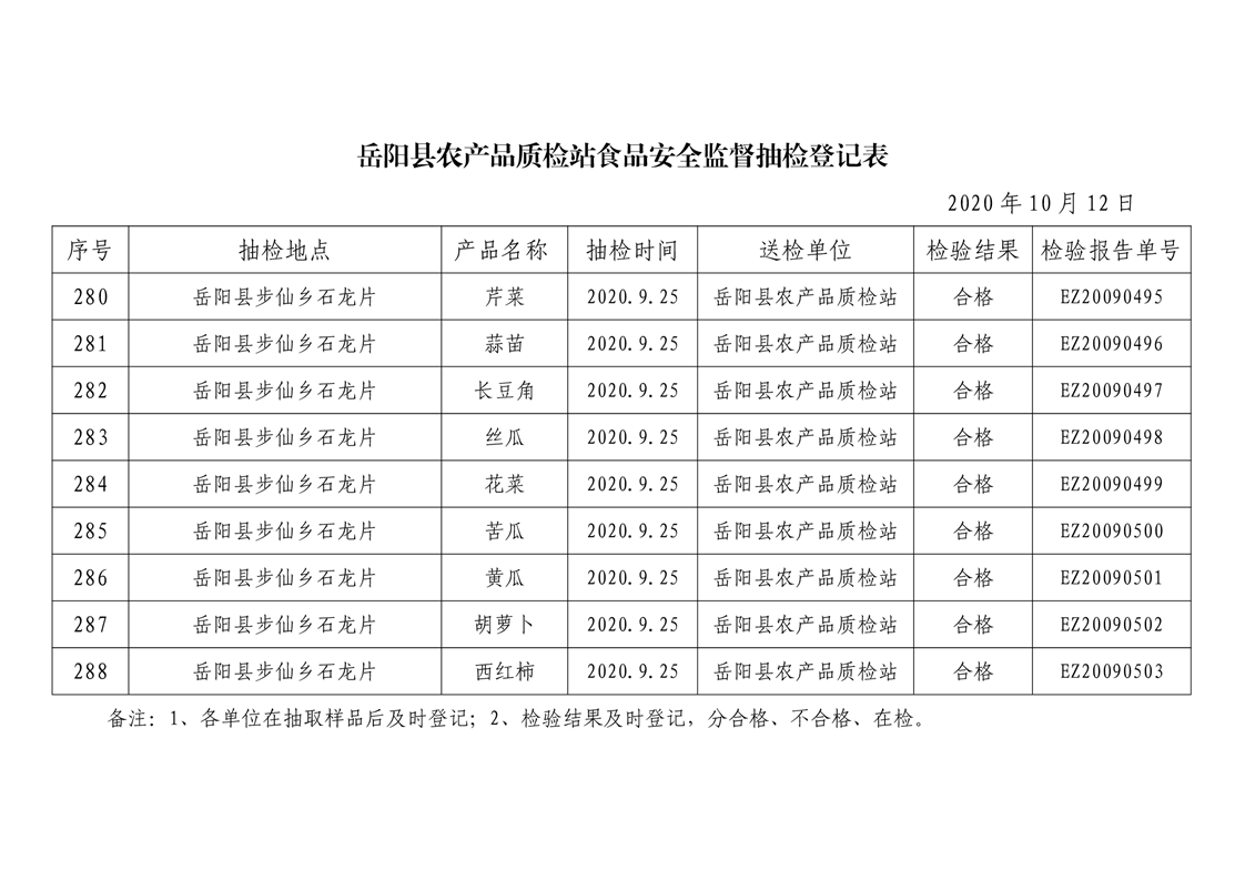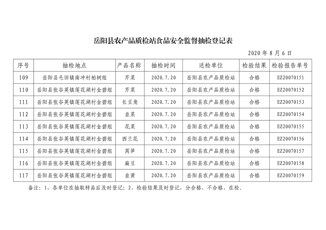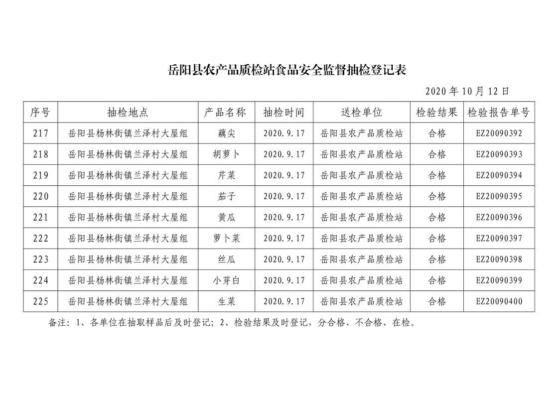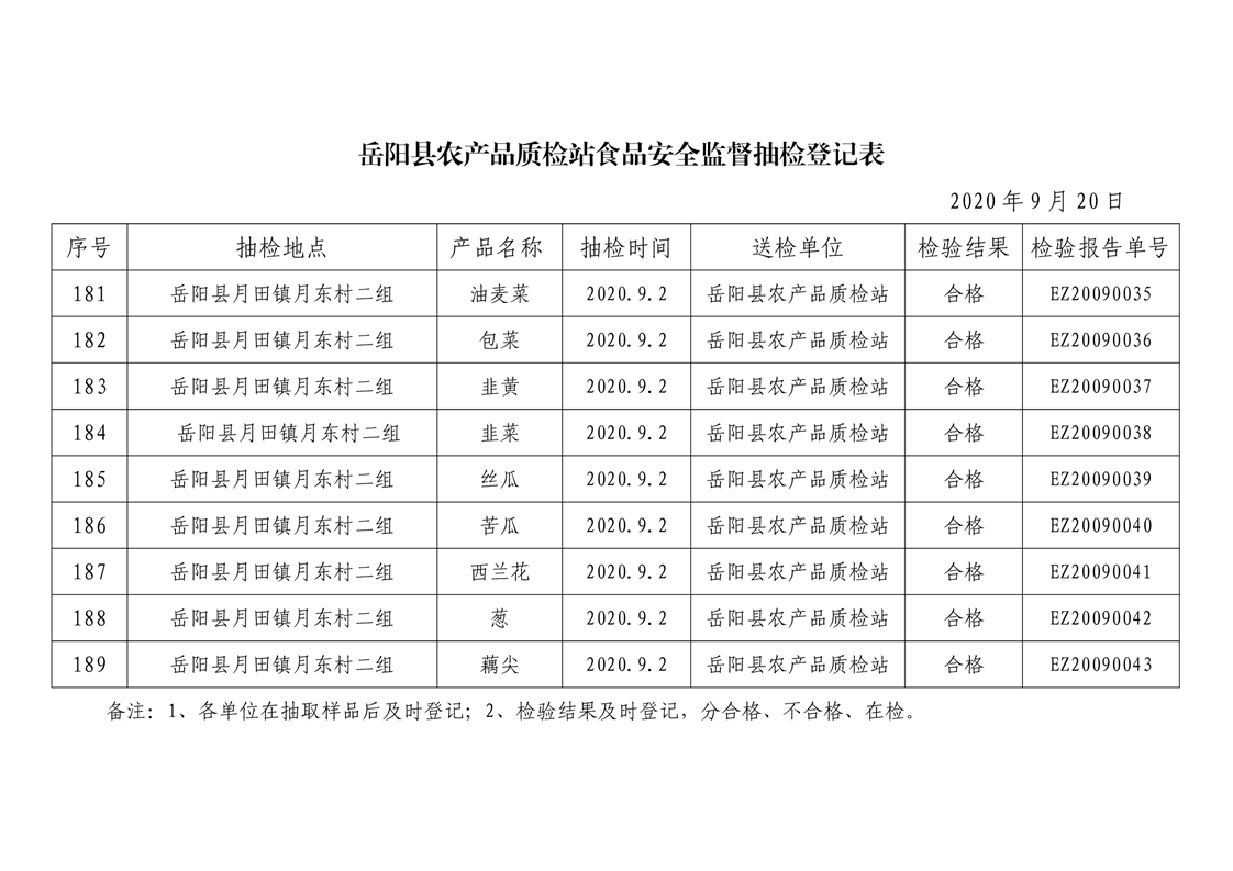 嶽陽縣農產品質檢站2020年食品安全監督抽檢情況公示