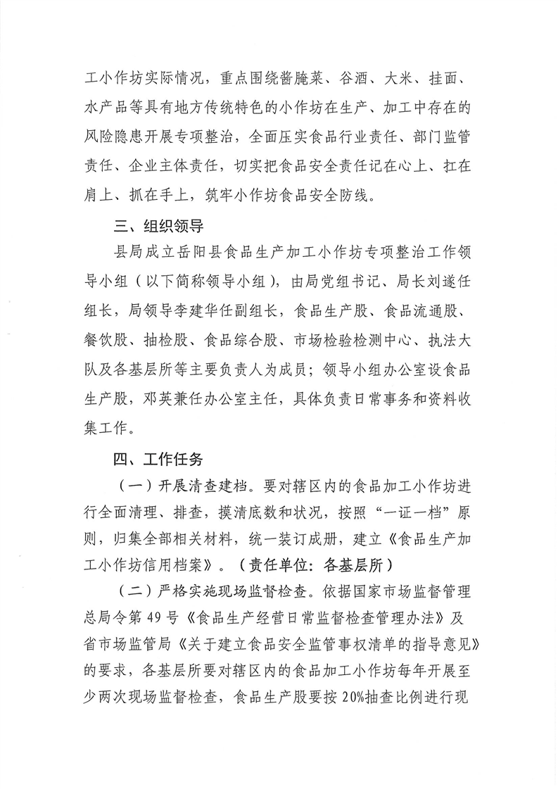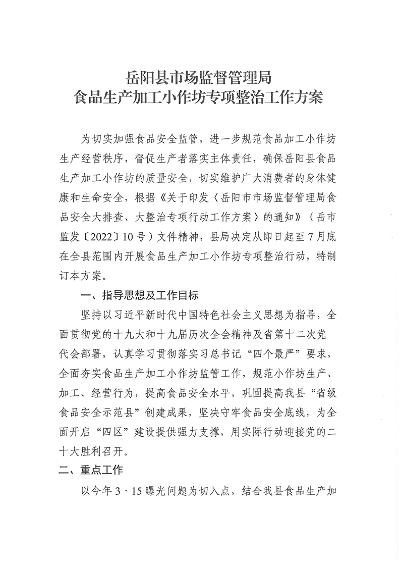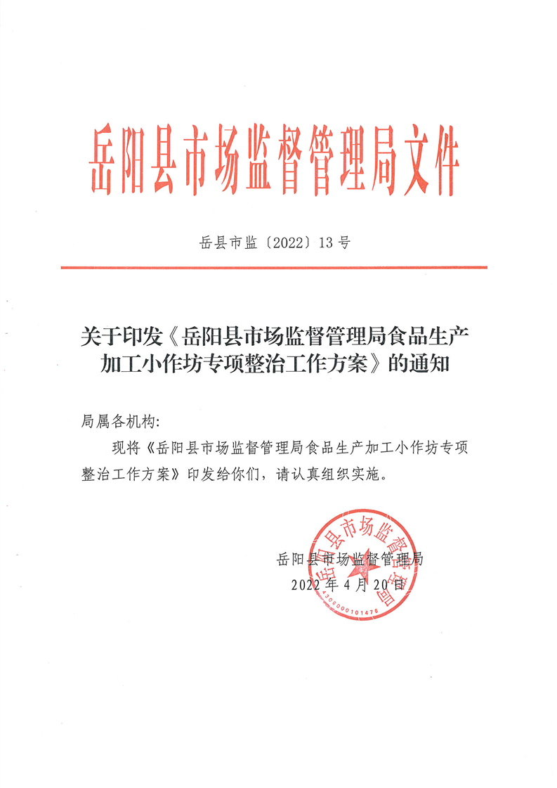 嶽縣市監〔2022〕13號關於印發《嶽陽縣市場監督管理局食品生產加工小作坊專項整治工作方案》的通知
