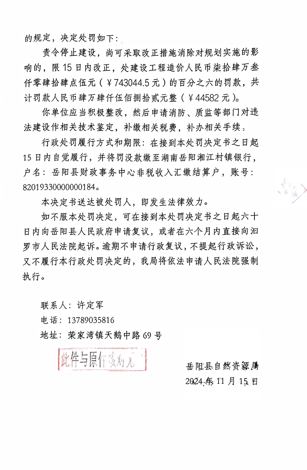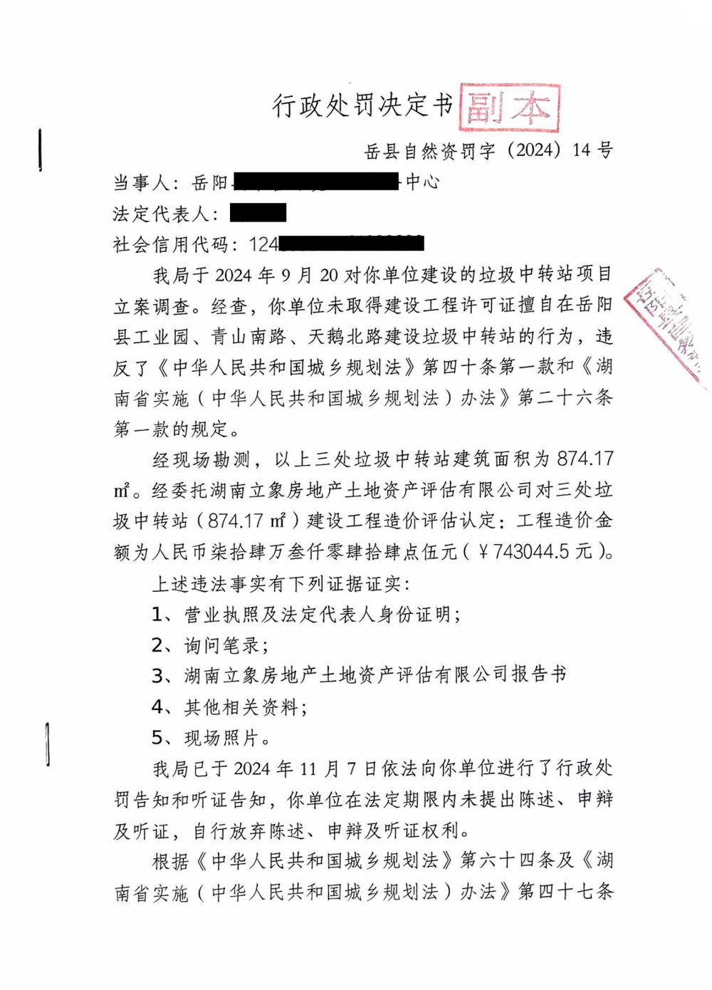 行政處罰決定書 嶽縣自然資罰決〔2024〕第14號
