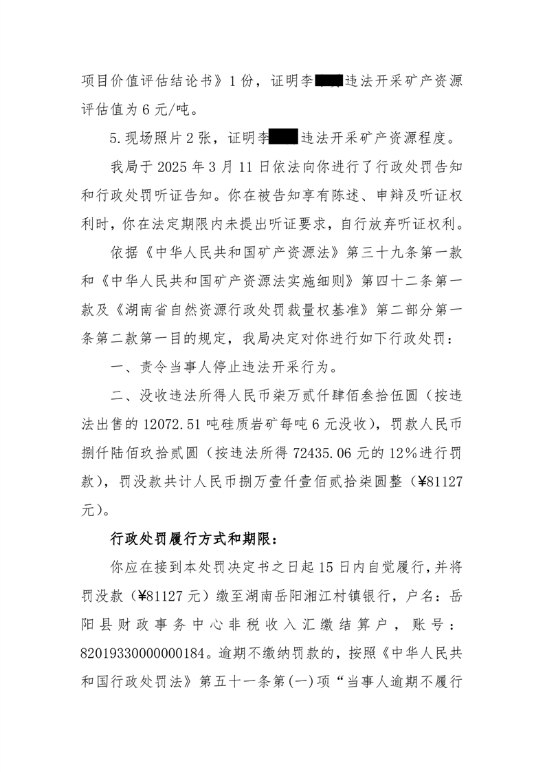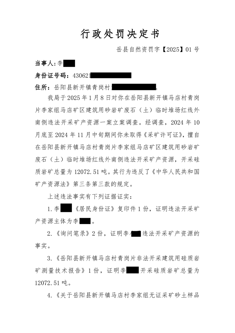 行政處罰決定書 嶽縣自然資罰字【2025】01 號