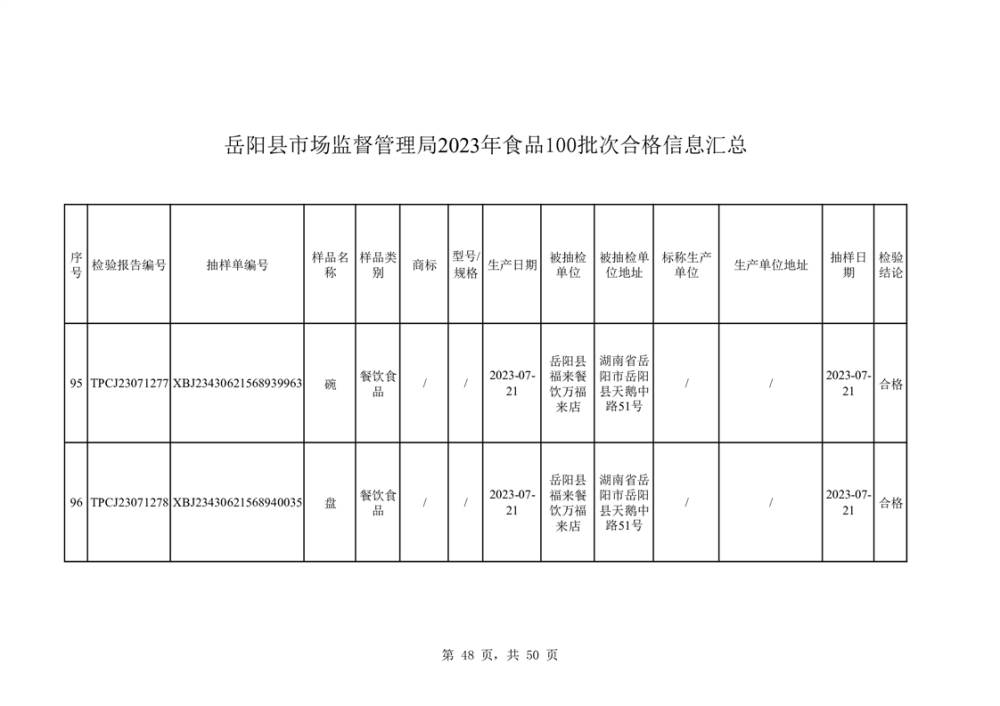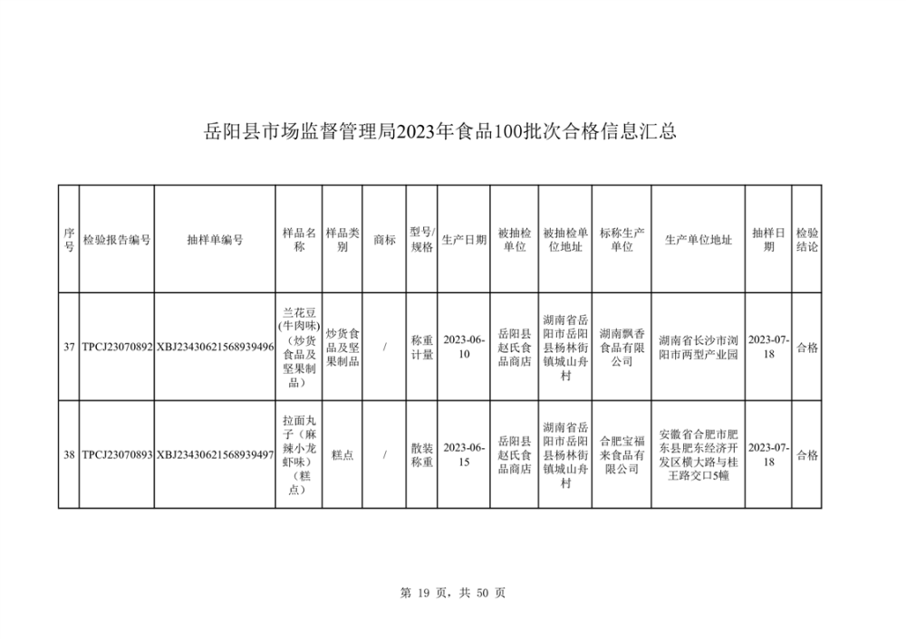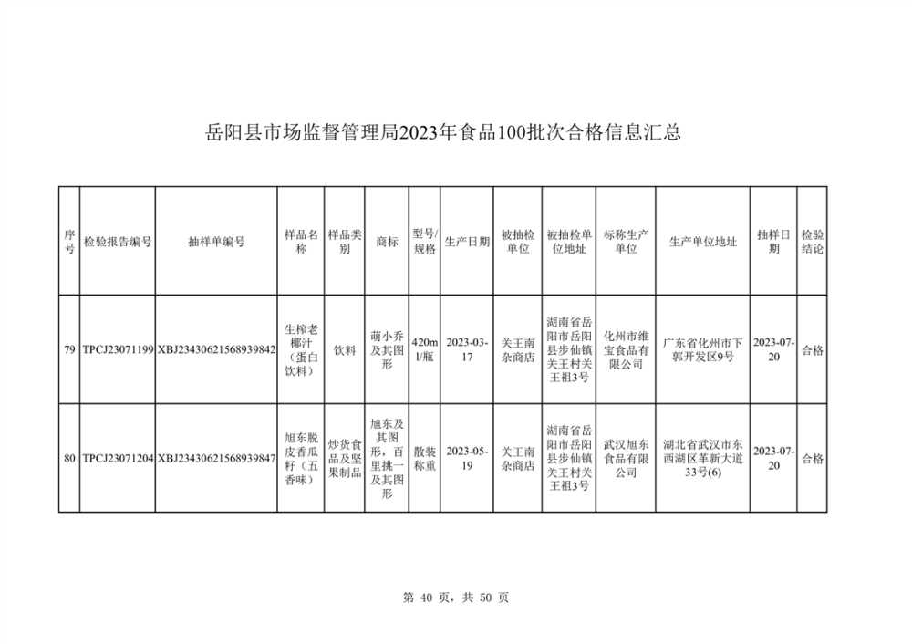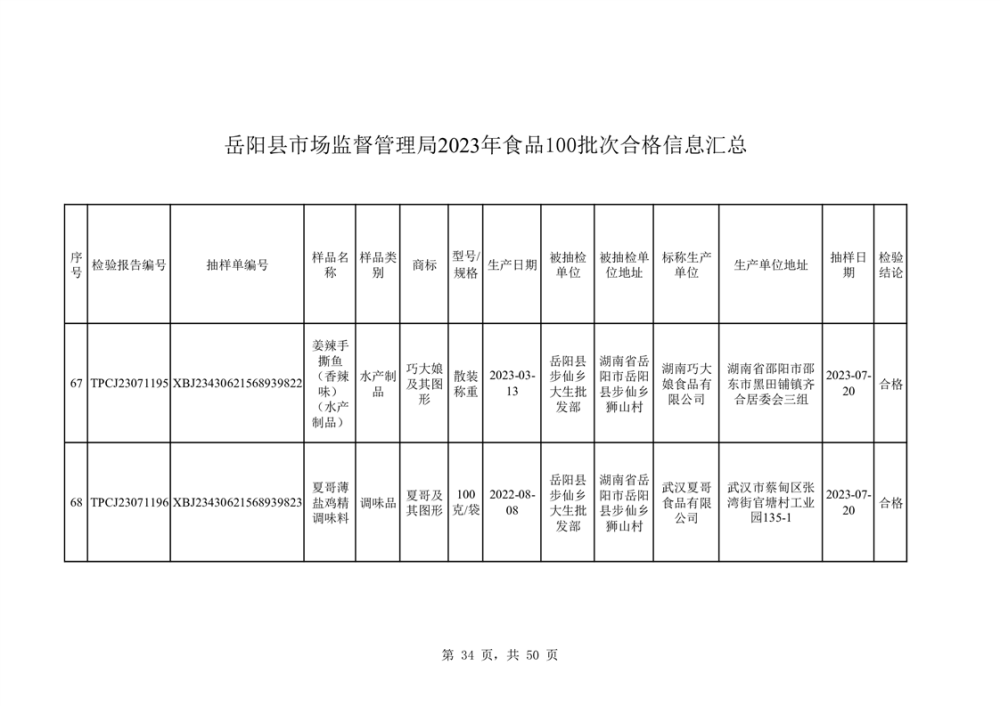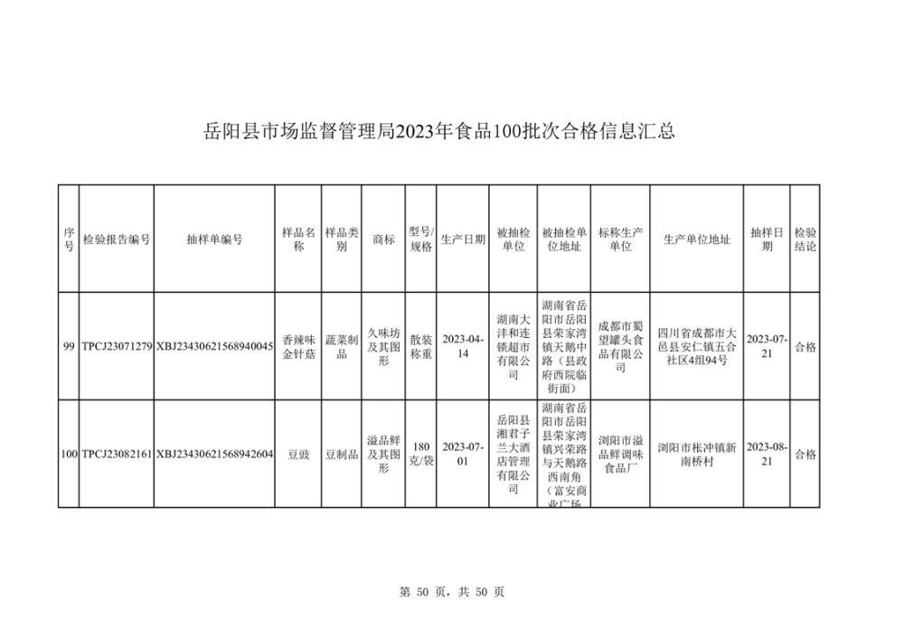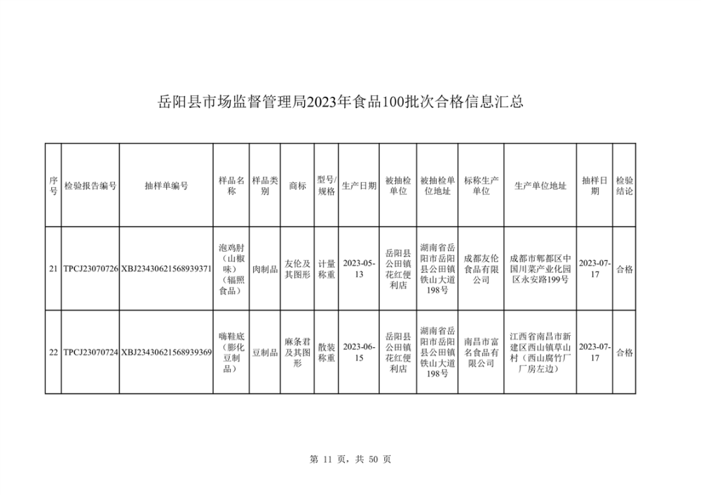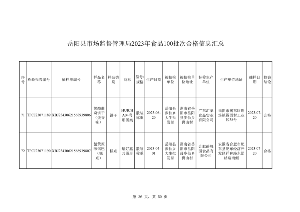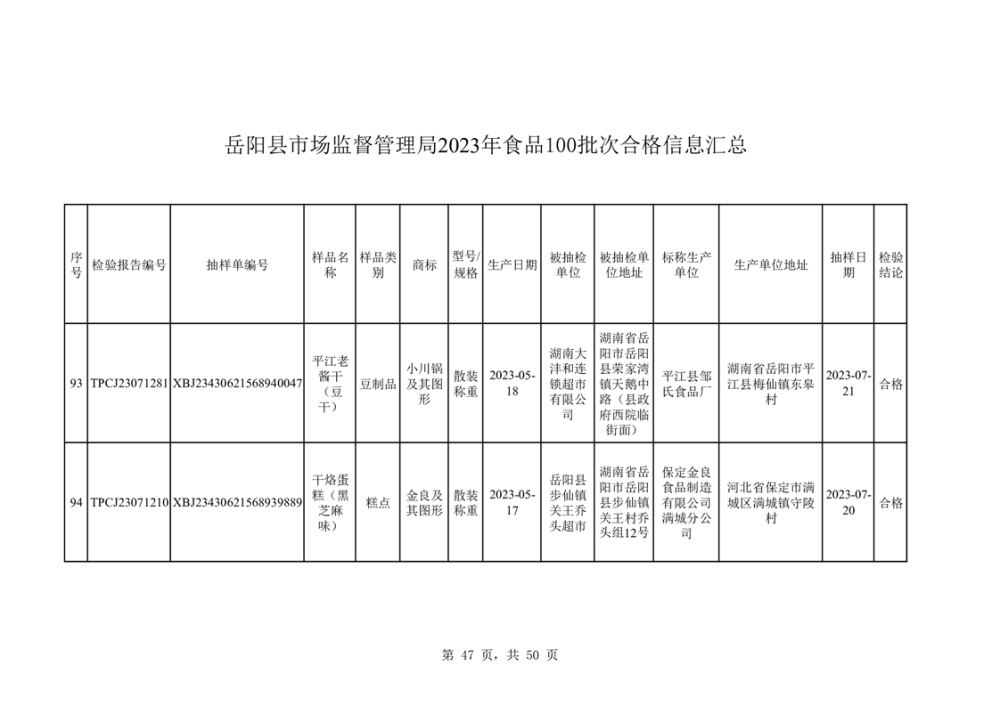 2023年嶽陽縣市場監督管理局食品合格信息匯總(100批次)