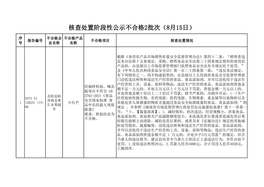 核查處置階段性信息公示不合格2批次(2025年8月15日)