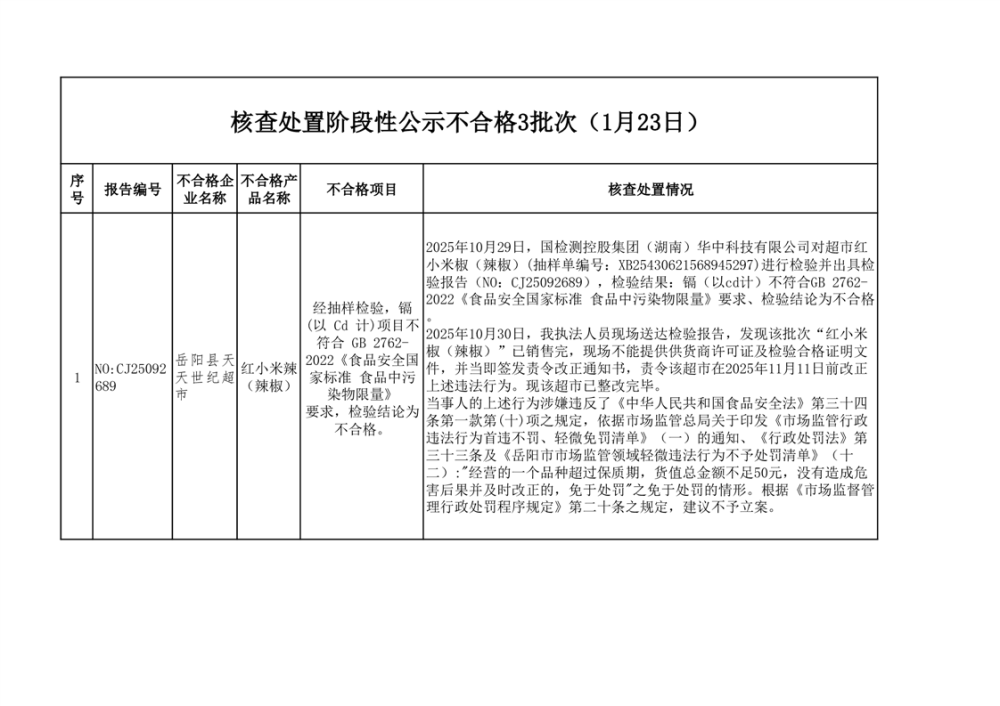 核查處置階段性公示不合格3批次(2026年1月23日)