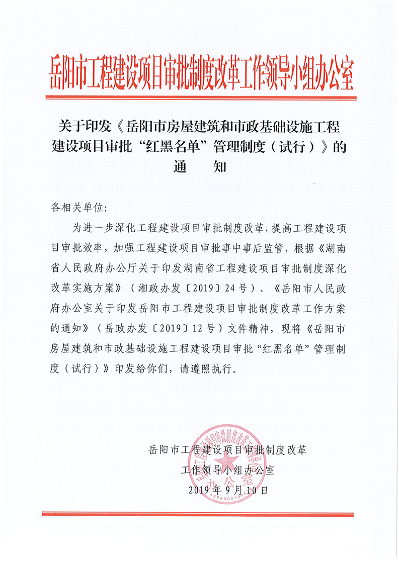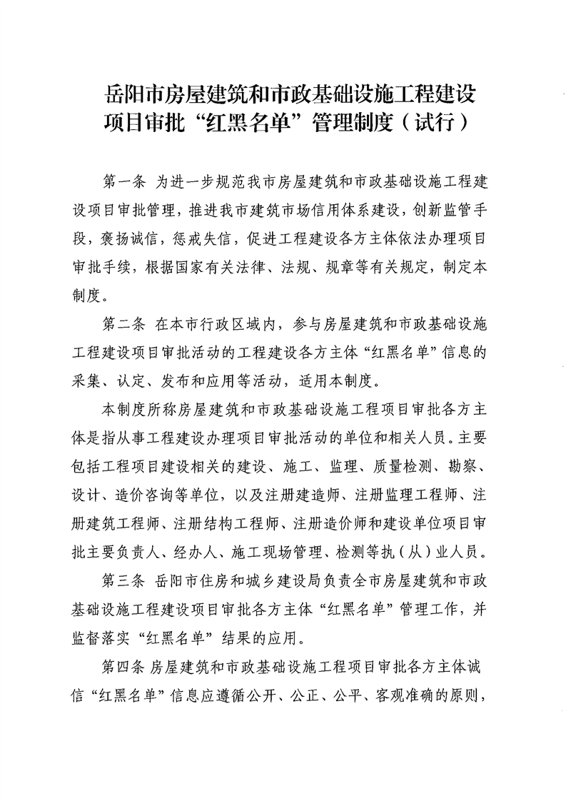 嶽陽市房屋建築和市政基礎設施工程建設項目審批“紅黑名單”管理製度(試行)