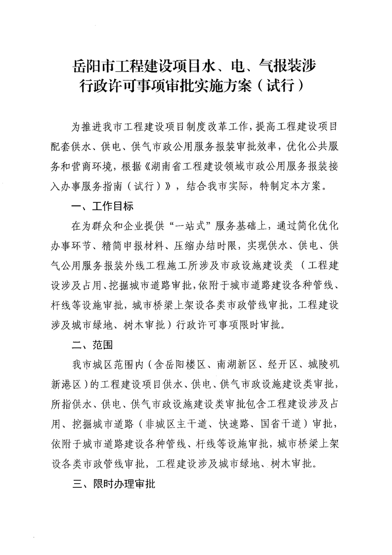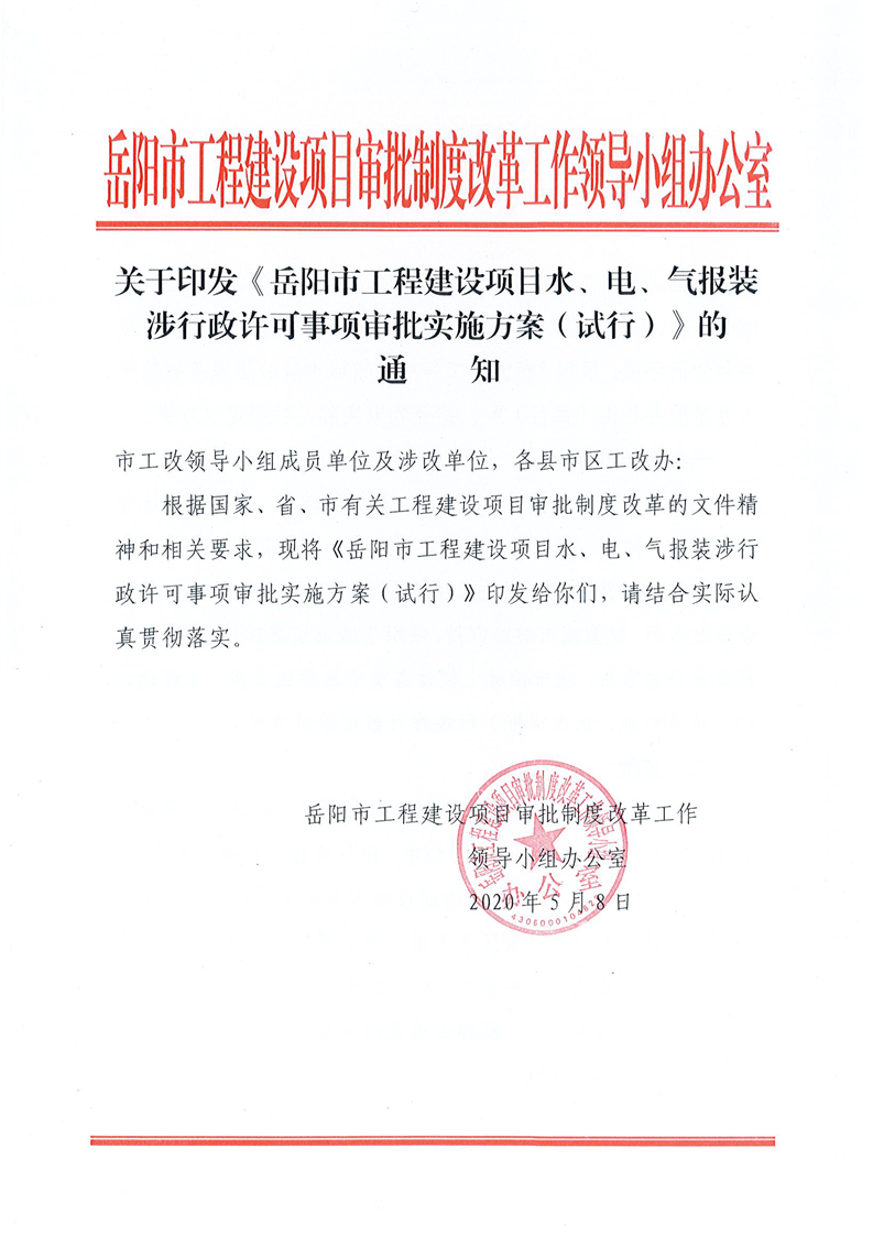 關於印發《嶽陽市工程建設項目水、電、氣報裝涉行政許可事項審批實施方案(試行)》的通知