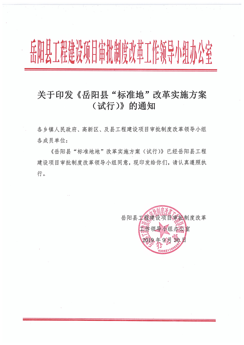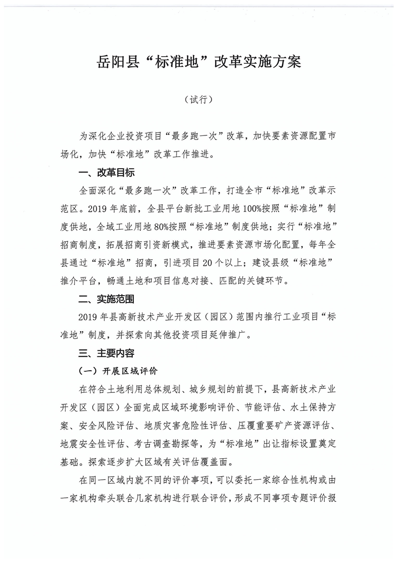 關於印發《嶽陽縣“標準地”改革實施方案(試行)》的通知