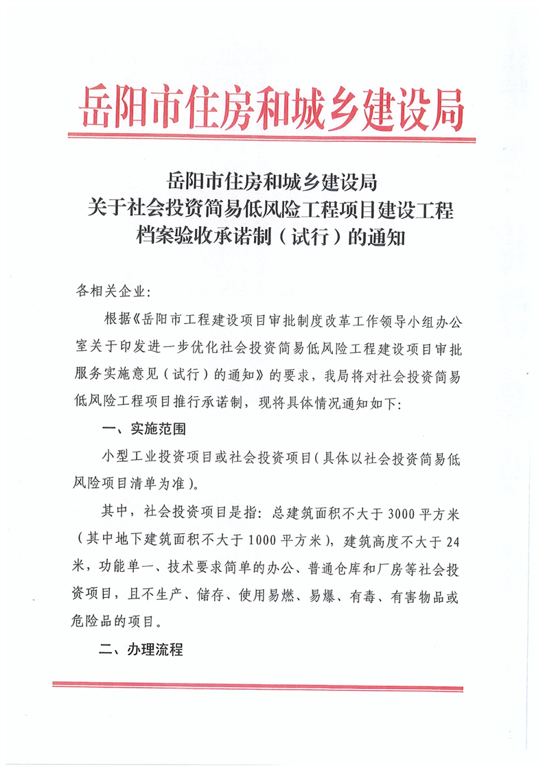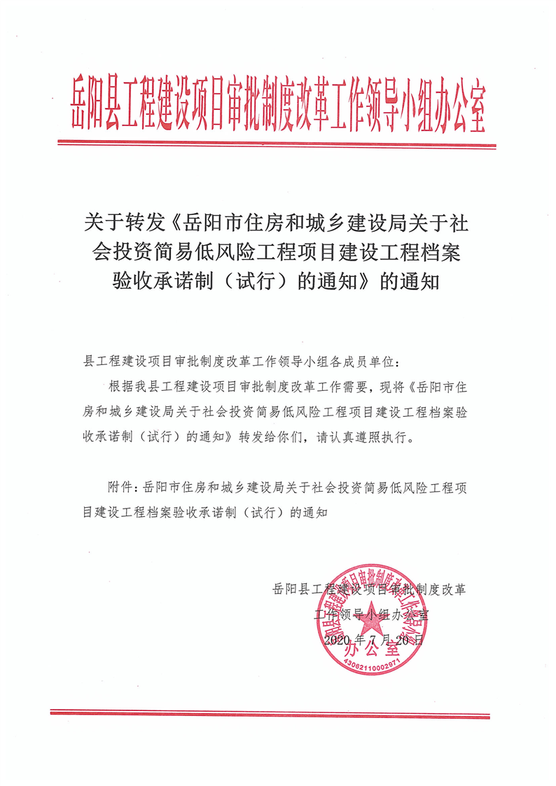 關於轉發《嶽陽市住房和城鄉建設局關於社會投資簡易低風險工程項目建設工程檔案驗收承諾製(試行)的通知》