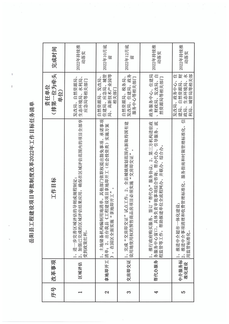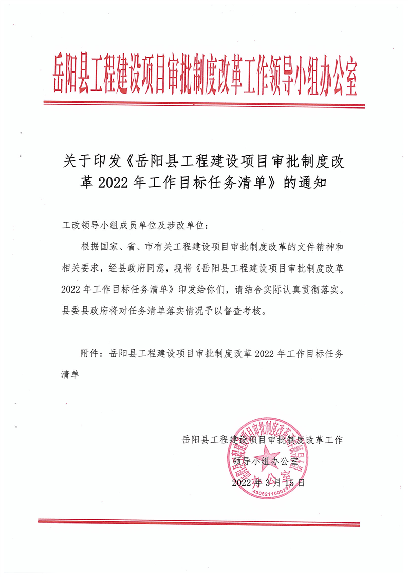 關於印發《嶽陽縣工程建設項目審批製度改革2022年工作目標任務清單》的通知