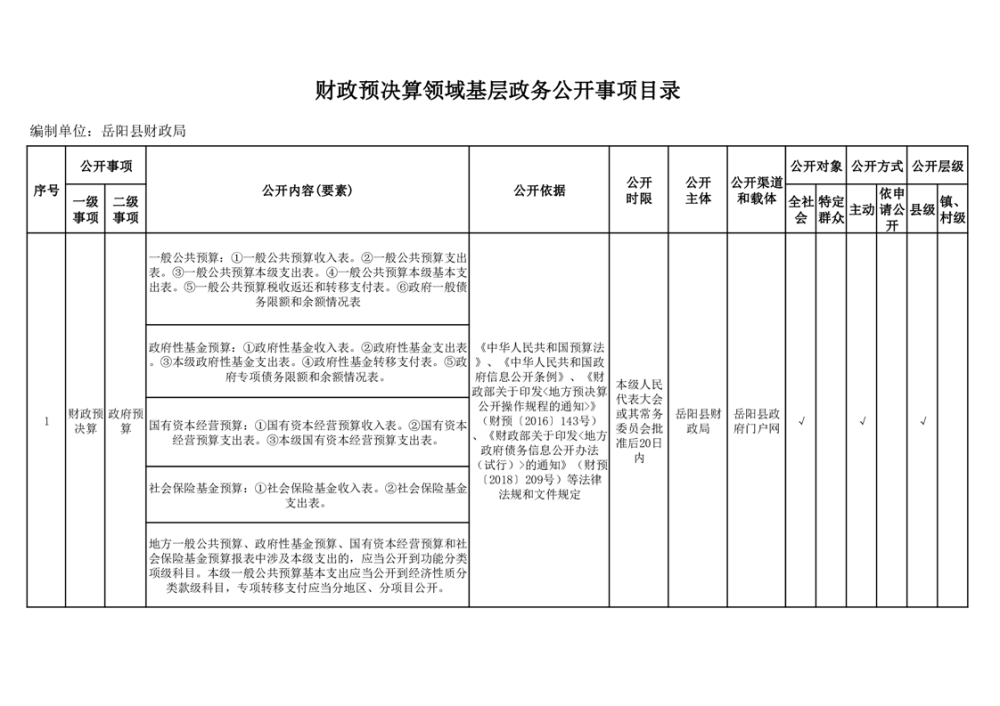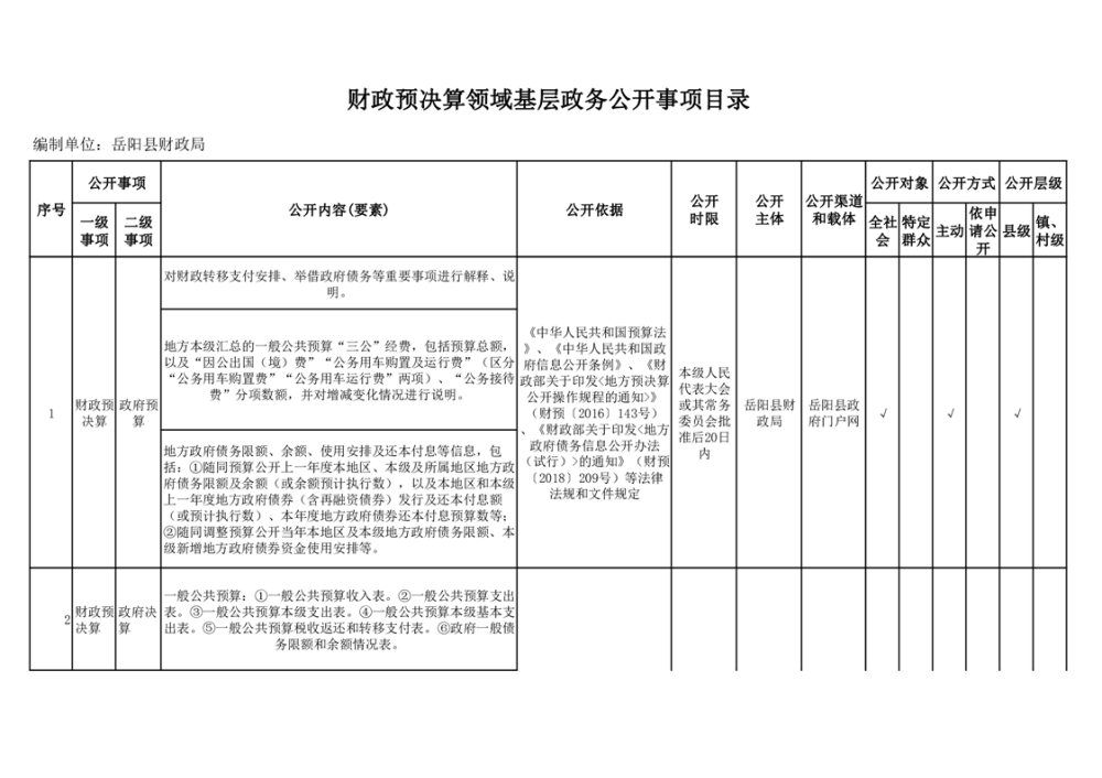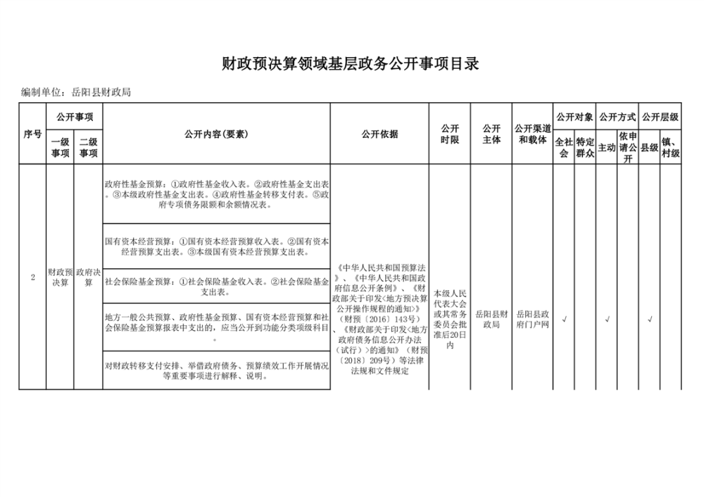 2024年嶽陽縣財政預決算領域基層政務公開標準目錄