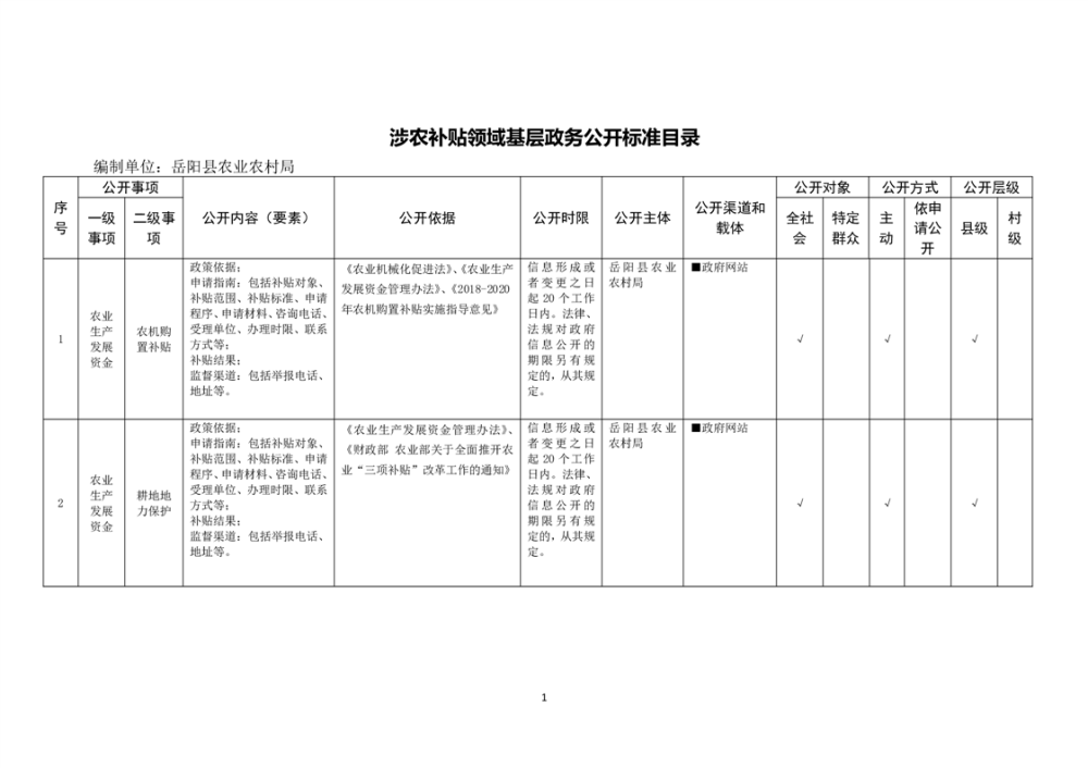 2024年嶽陽縣涉農補貼領域基層政務公開標準目錄