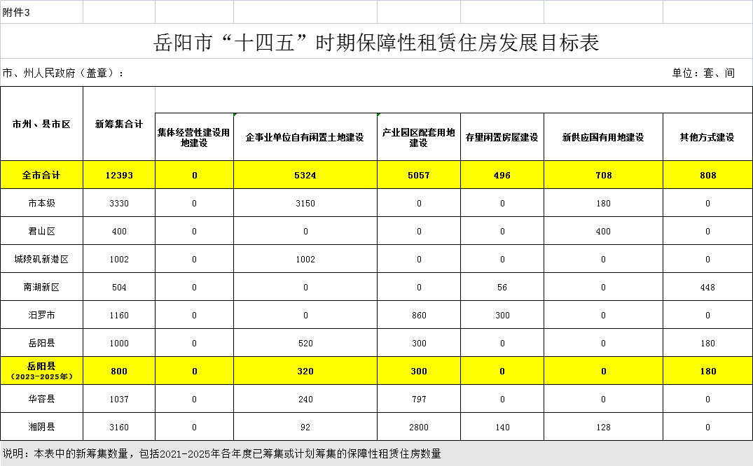 嶽陽市“十四五”時期保障性租賃住房發展目標表