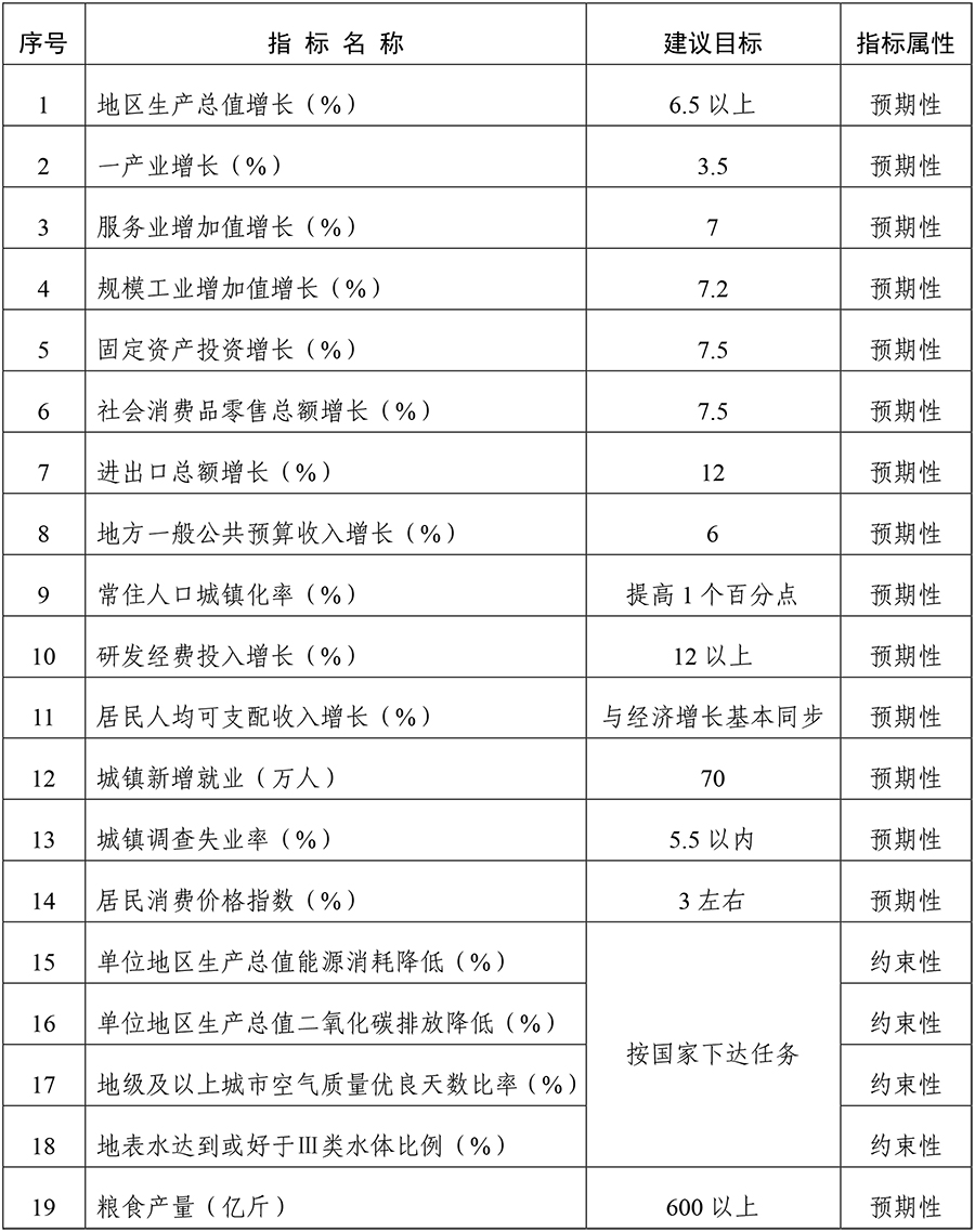 按照省委經濟工作會議總體部署,2022年經濟社會發展主要預期目標是:地區生產總值增長6.5%以上,規模工業增加值增長7.2%,固定資產投資增長7.5%,社會消費品零售總額增長7.5%,進出口增長12%,地方一般公共預算收入增長6%,居民消費價格漲幅3%左右,城鎮新增就業70萬人,城鎮調查失業率5.5%以內,居民收入增長與經濟增長基本同步,糧食產量600億斤以上,生態環境指標穩步改善。