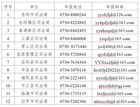 1.市司法局和各縣(市區)司法局舉報郵箱、舉報電話。