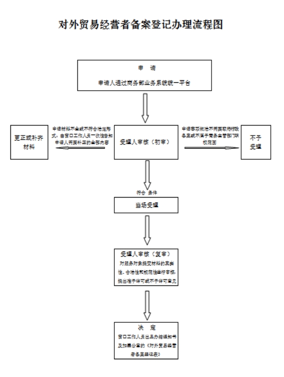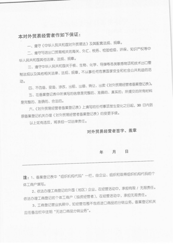 《中華人民共和國對外貿易法》(1994年5月12日第八屆全國人民代表大會常務委員會第七次會議通過2004年4月6日第十屆全國人民代表大會常務委員會第八次會議修訂2016年11月7日第十二屆全國人民代表大會常務委員會第二十四次會議修訂2016年11月7日中華人民共和國主席令第五十七號公布自2016年11月7日起施行)第九條:從事貨物進出口或者技術進出口的對外貿易經營者,應當向國務院對外貿易主管部門或者其委托的機構辦理備案登記;但是,法律、行政法規和國務院對外貿易主管部門規定不需要備案登記的除外。備案登記的具體辦法由國務院對外貿易主管部門規定。對外貿易經營者未按照規定辦理備案登記的,海關不予辦理進出口貨物的報關驗放手續。
