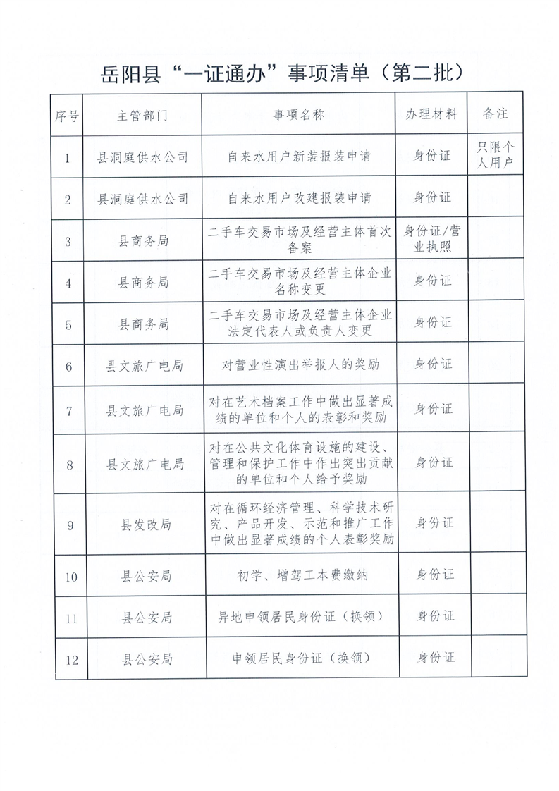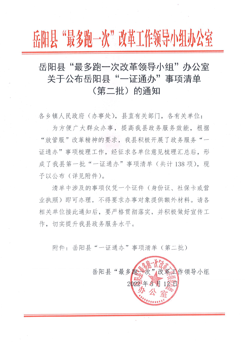 嶽陽縣“最多跑一次改革領導小組”辦公室關於公布嶽陽縣“一證通辦”事項清單(第二批)的通知