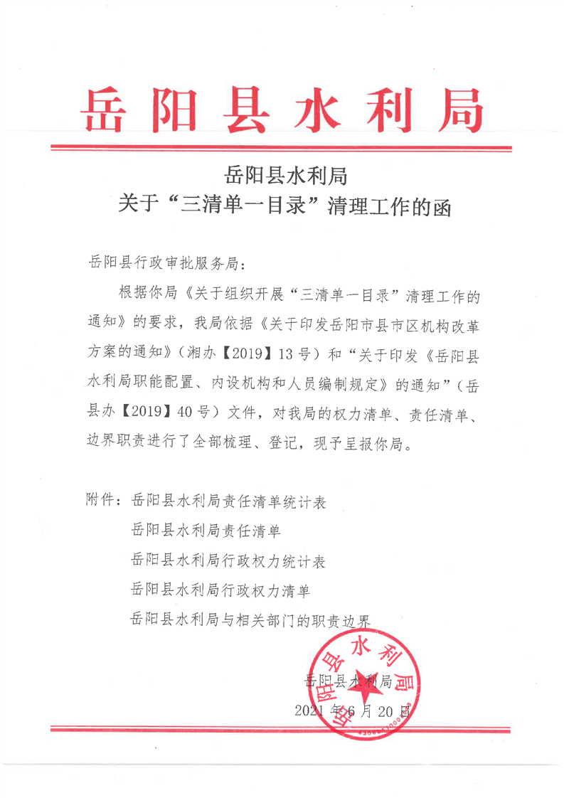 嶽陽縣水利局關於“三清單一目錄”清理工作的函