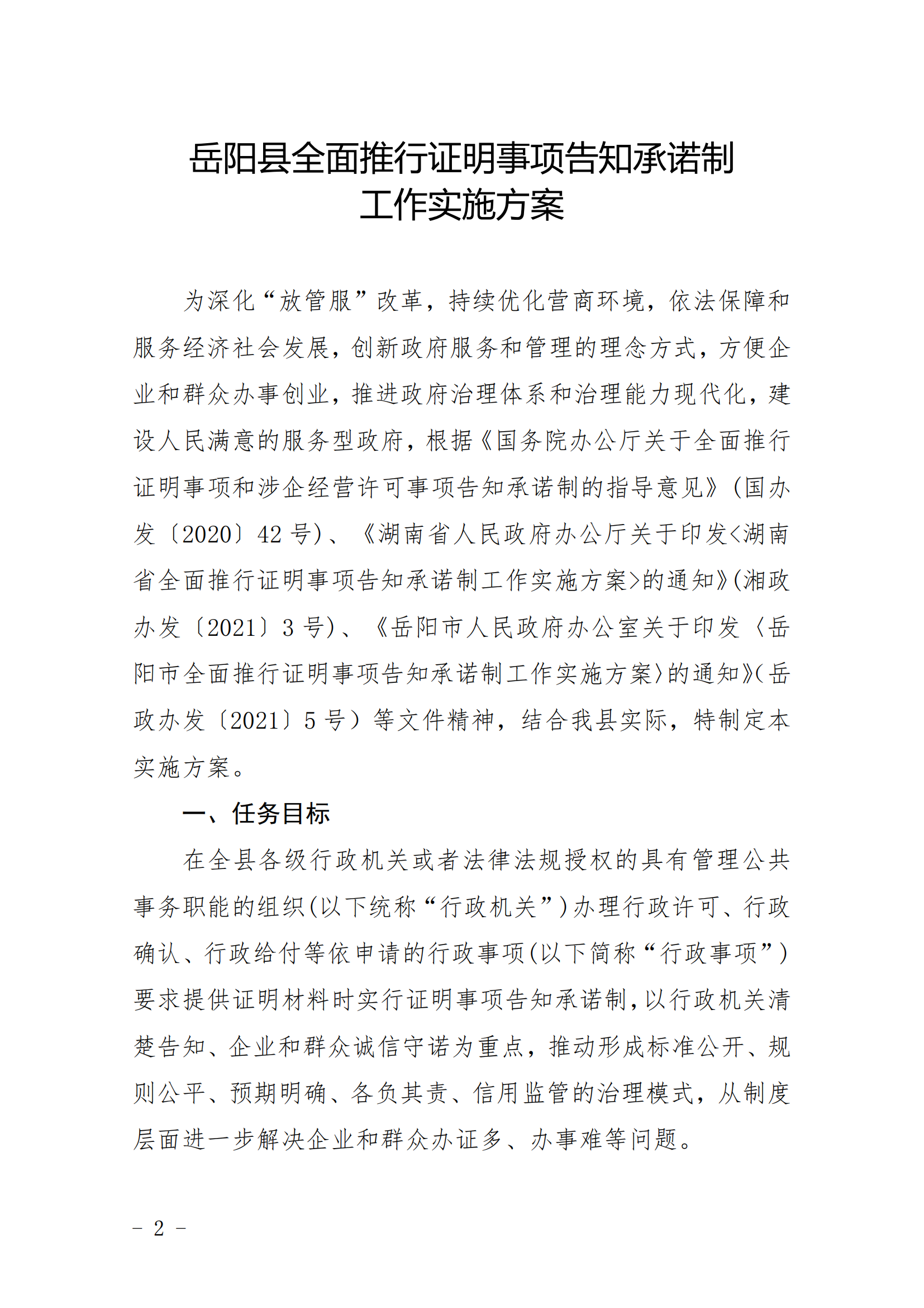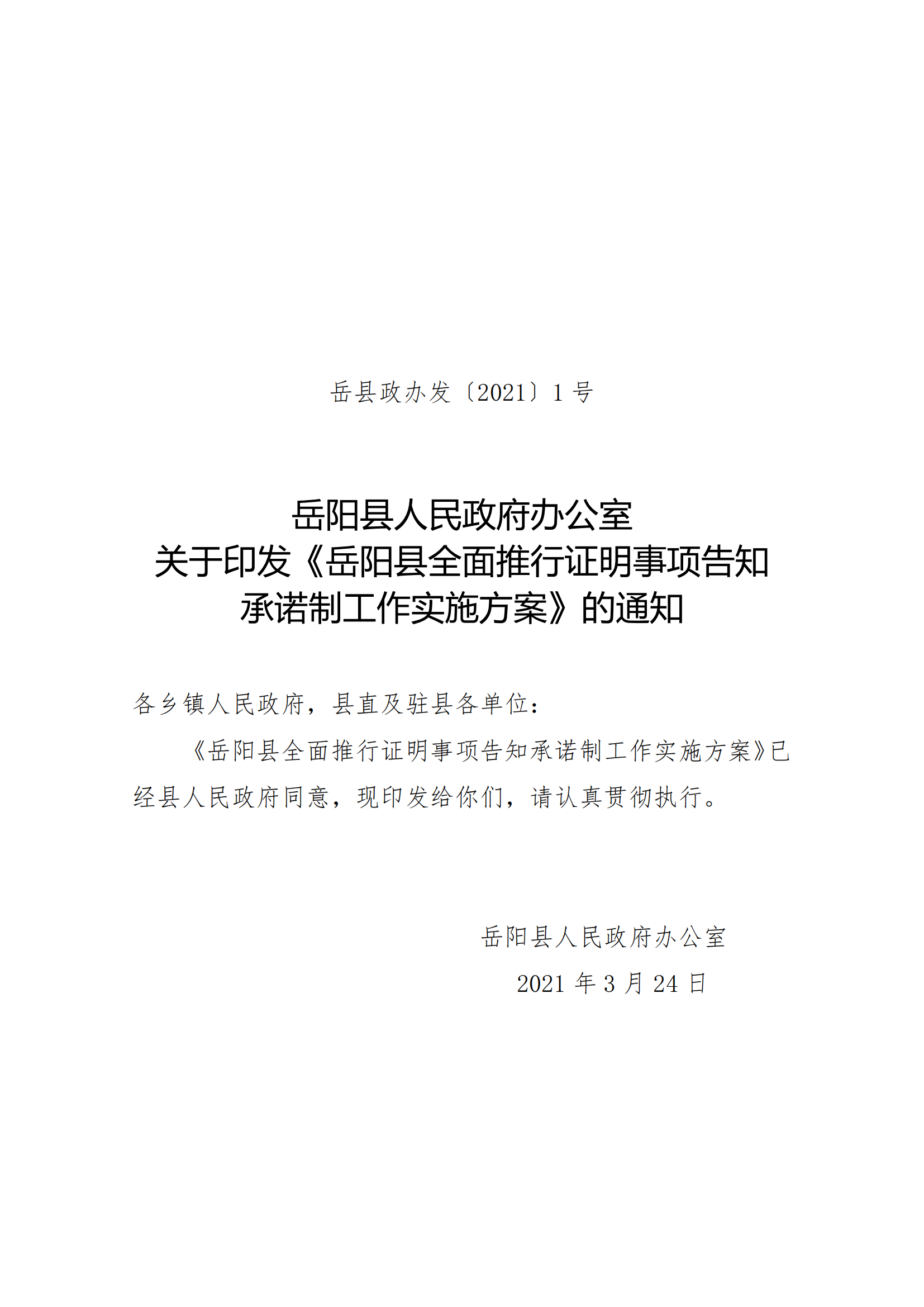 嶽陽縣人民政府辦公室 關於印發《嶽陽縣全麵推行證明事項告知 承諾製工作實施方案》的通知