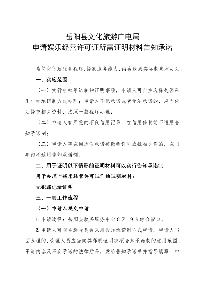嶽陽縣文化旅遊廣電局申請娛樂經營許可證所需證明材料告知承諾