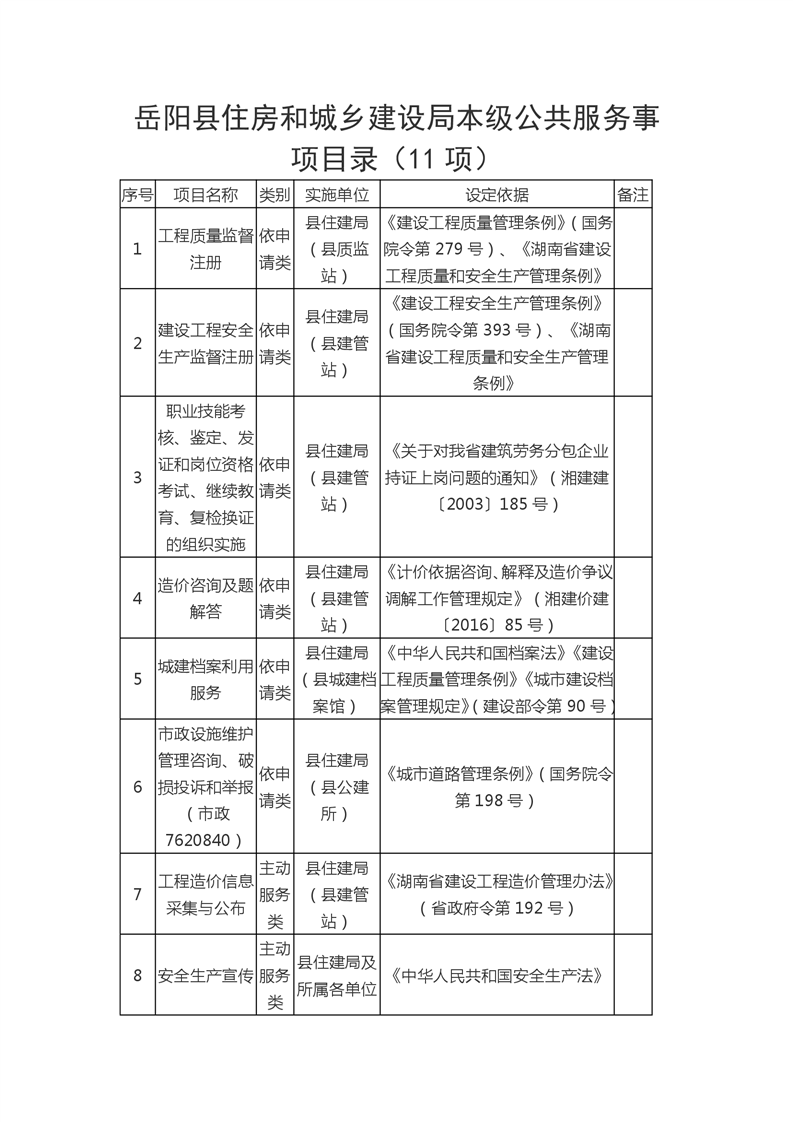 嶽陽縣住房和城鄉建設局本級公共服務事項目錄(11項)