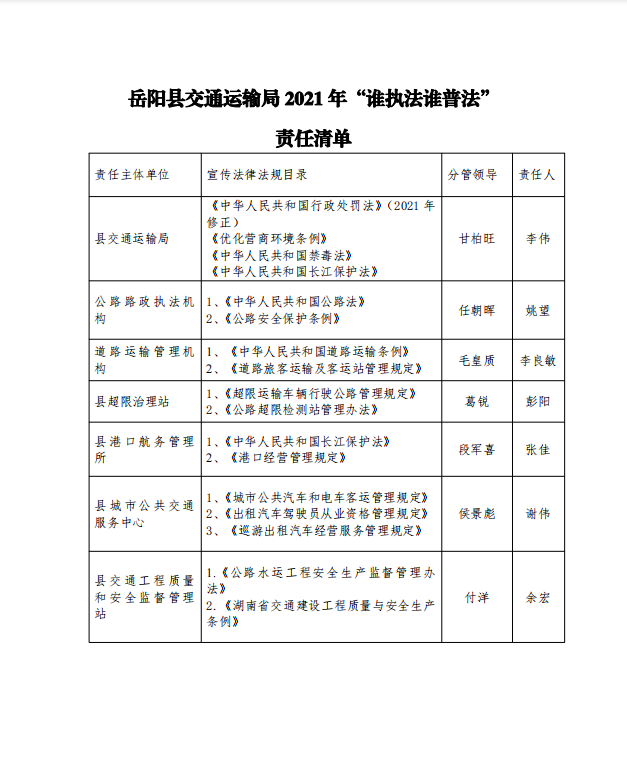 嶽陽縣交通運輸局2021年“誰執法誰普法”責任清單