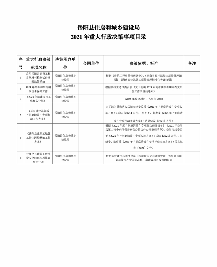 嶽陽縣住房和城鄉建設局2021年重大行政決策事項