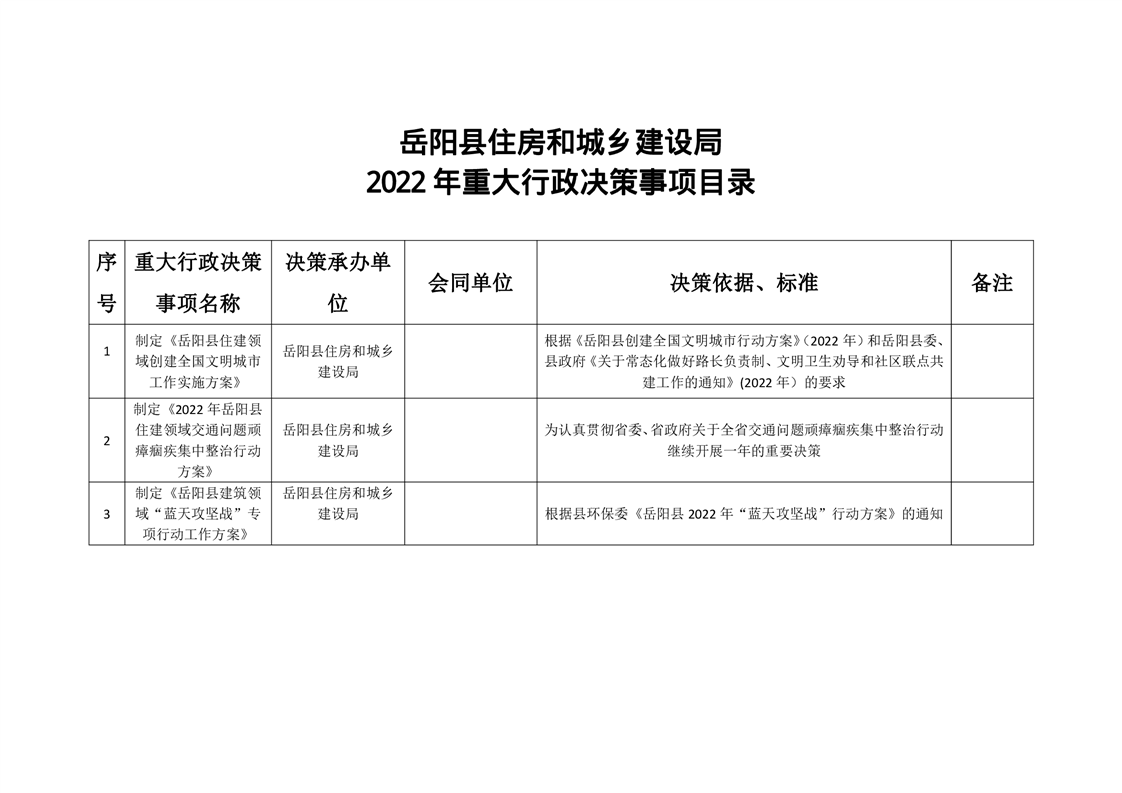 嶽陽縣住房和城鄉建設局2022年重大行政決策事項