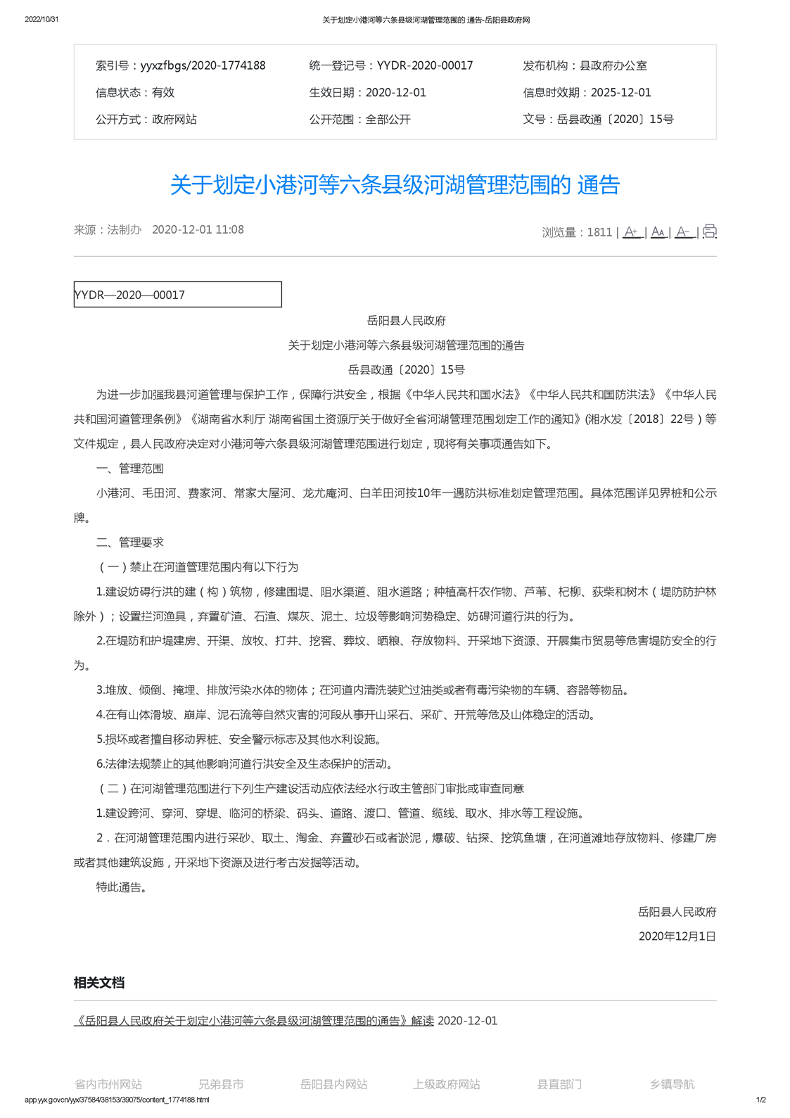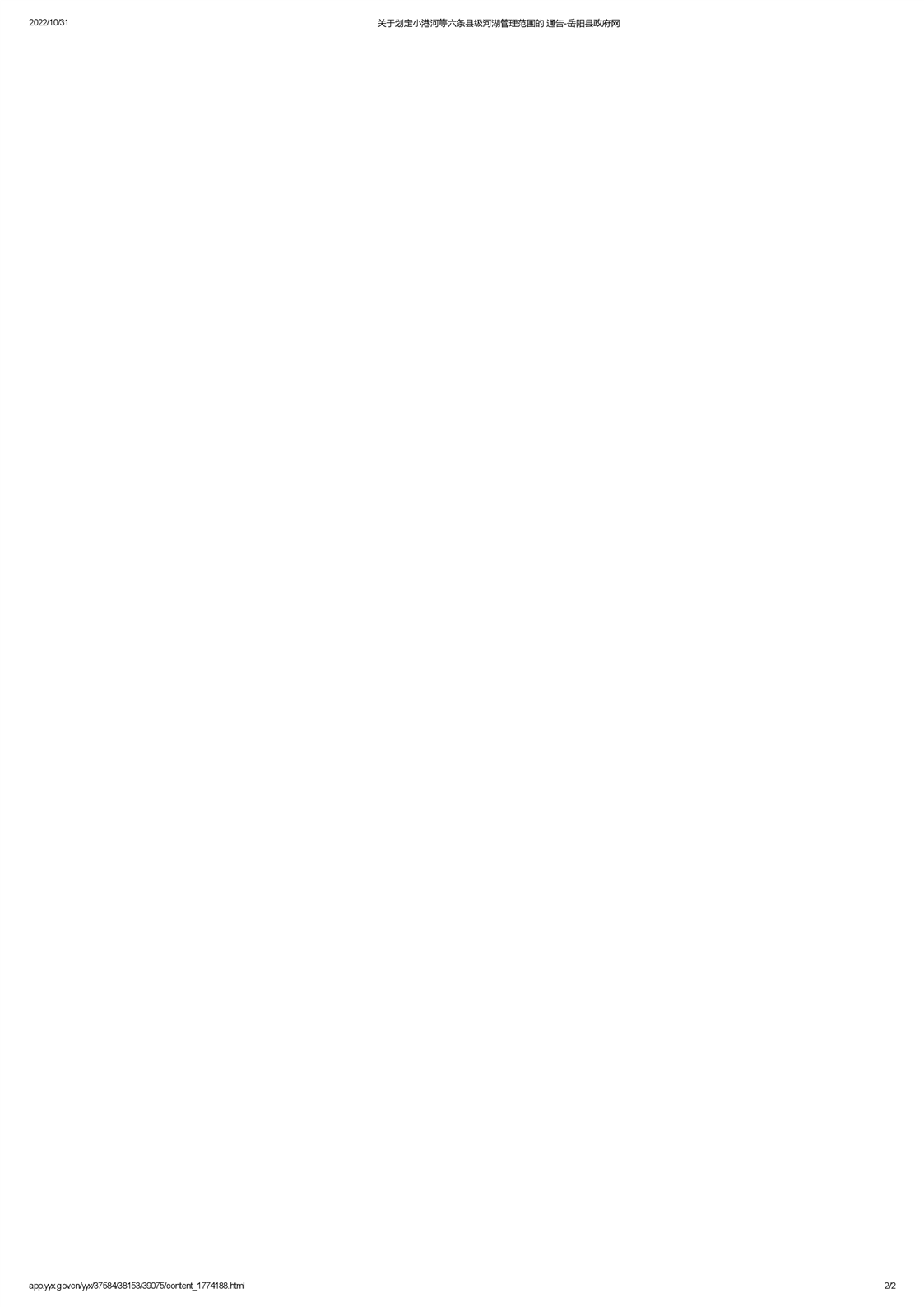 嶽陽縣人民政府關於劃定小港河等六條縣級河湖管理範圍的通告