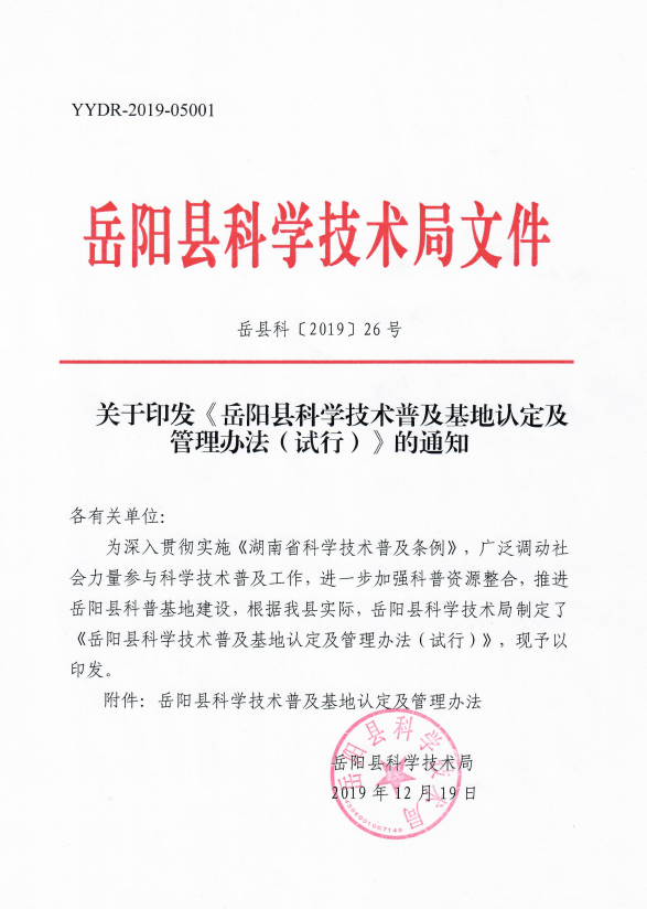 關於印發《嶽陽縣科學技術普及基地認定及管理辦法(試行)》的通知